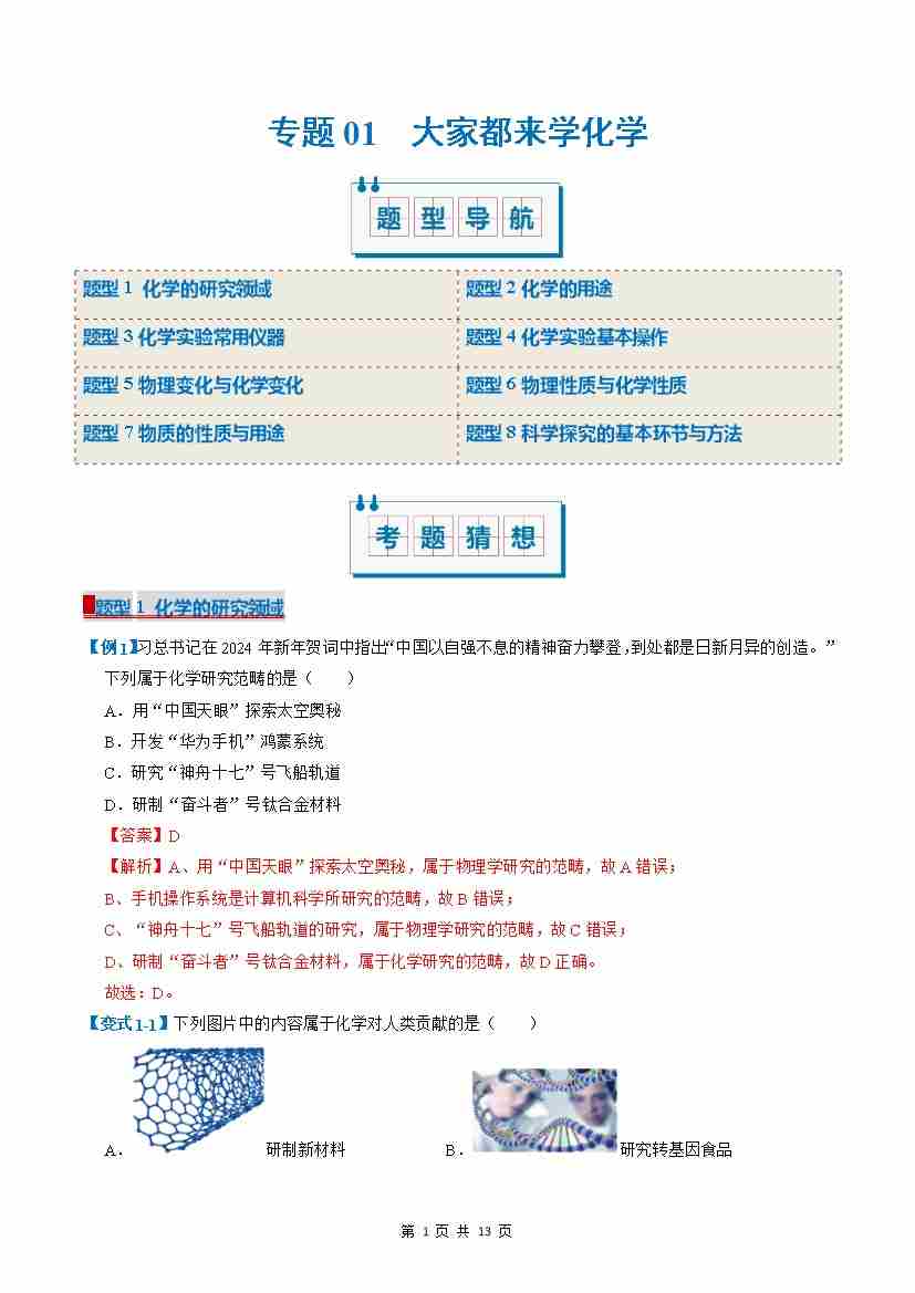 专题01 大家都来学化学(考题猜想)(8大题型)(解析版)