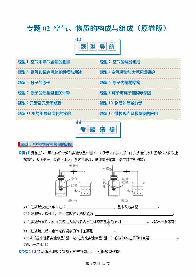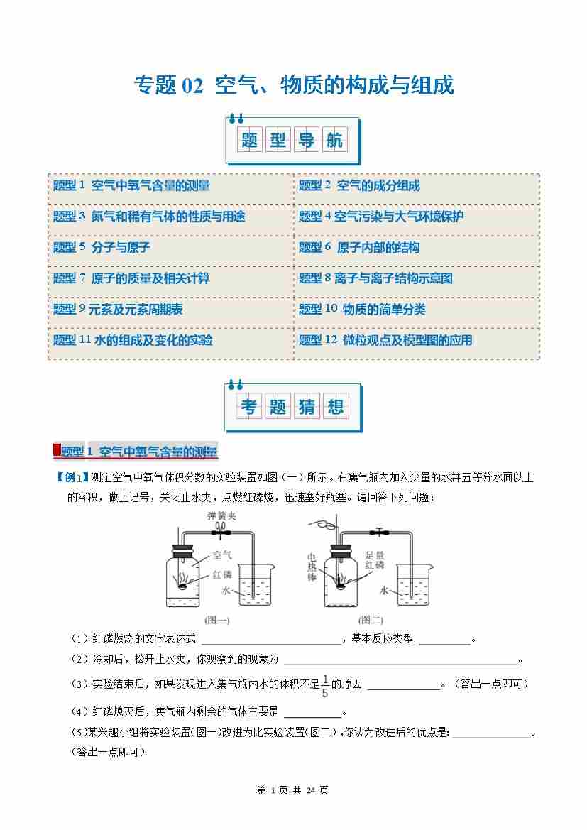 专题02 空气、物质的构成与组成(考题猜想)(8大题型)(原卷版)