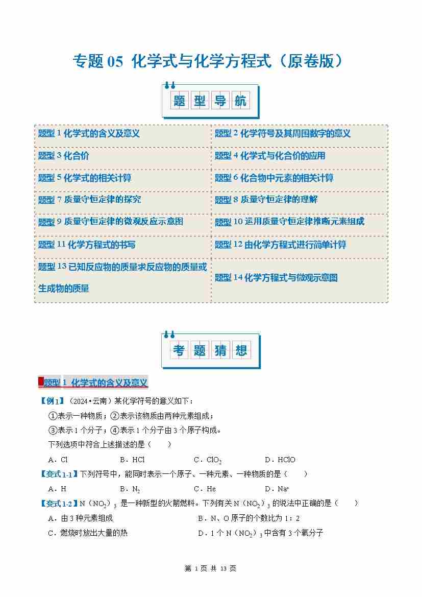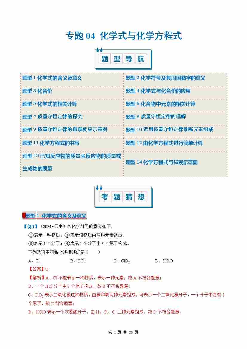 专题04 化学式与化学方程式(考题猜想)(14大题型)(原卷版)