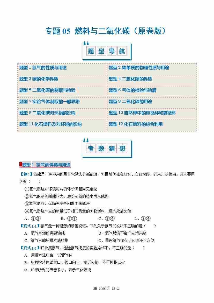 专题05 燃料与二氧化碳(考题猜想)(12大题型)(原卷版)