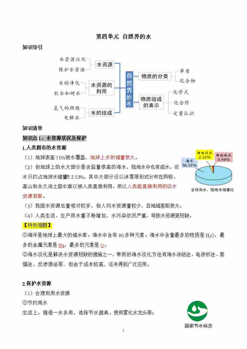 第4单元 自然界的水(单元知识清单)九年级化学上册同步高效课堂(人教版2024)