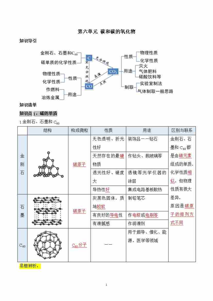 第6单元 碳和碳的氧化物(单元知识清单)九年级化学上册同步高效课堂(人教版2024)