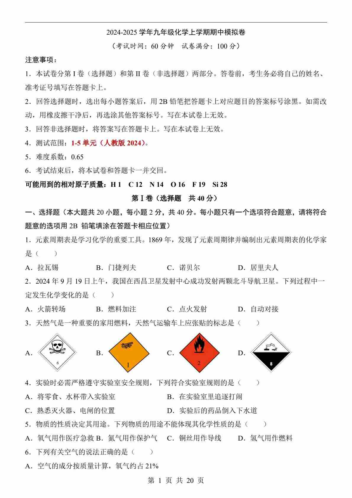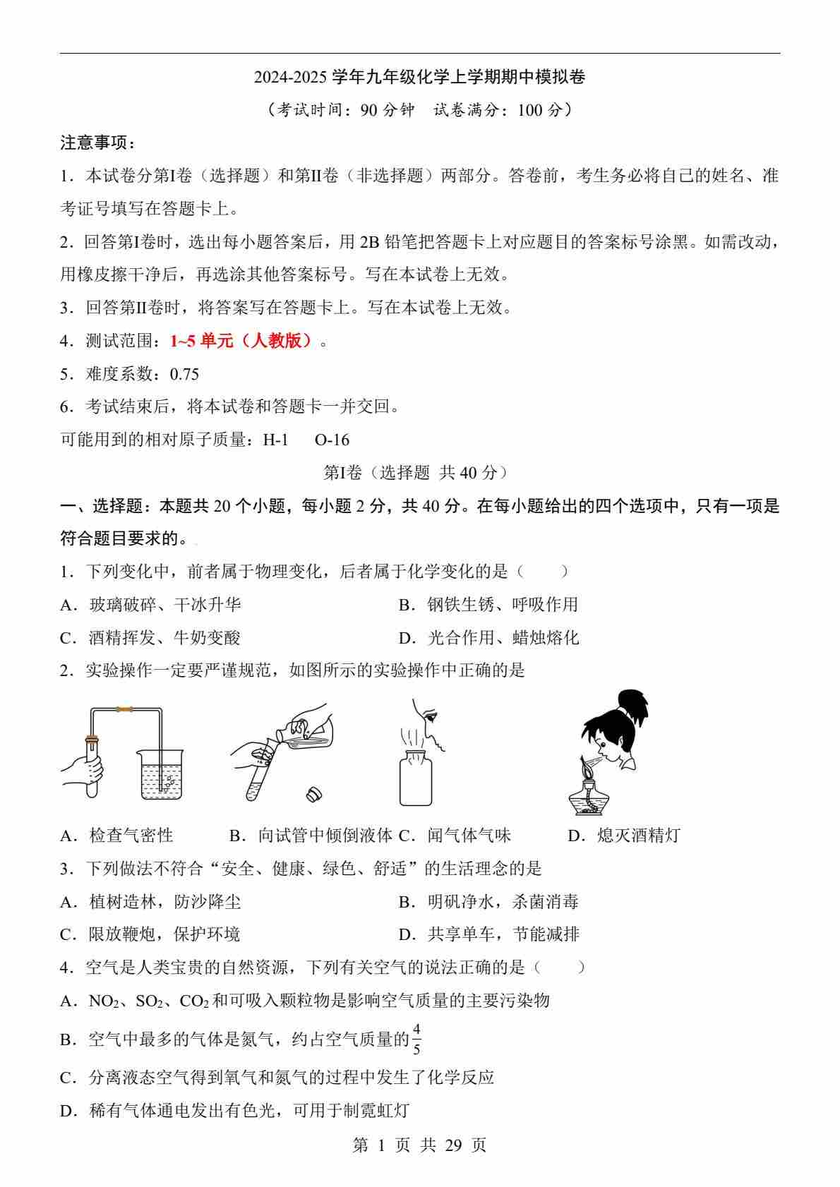 【人教】9上化学期中卷01【第1-5单元】