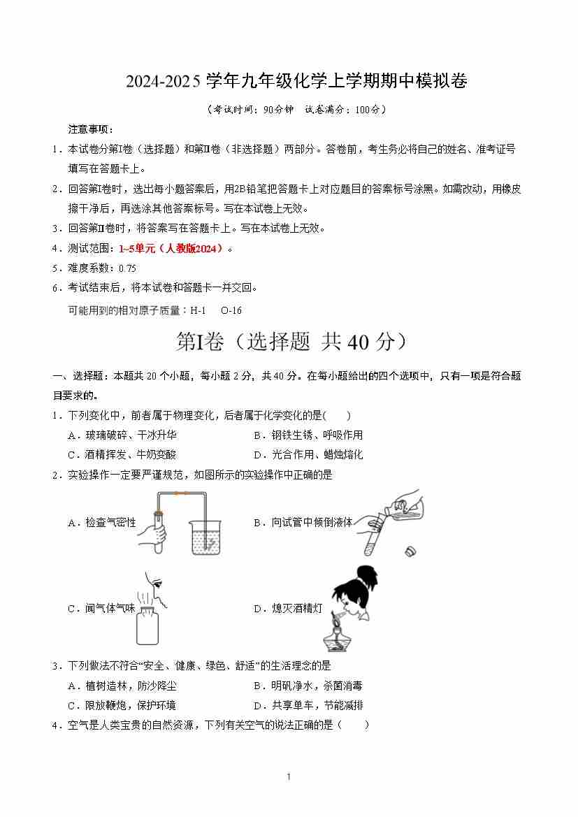 九年级化学期中模拟卷01【测试范围:1~5单元】(人教版2024)(考试版A4)
