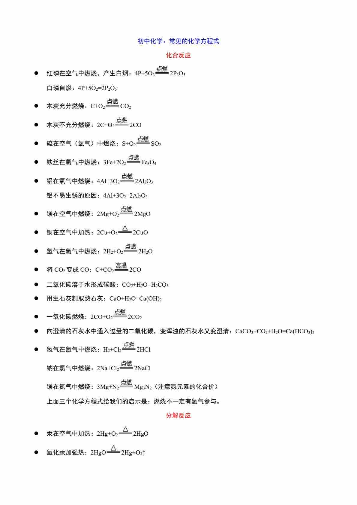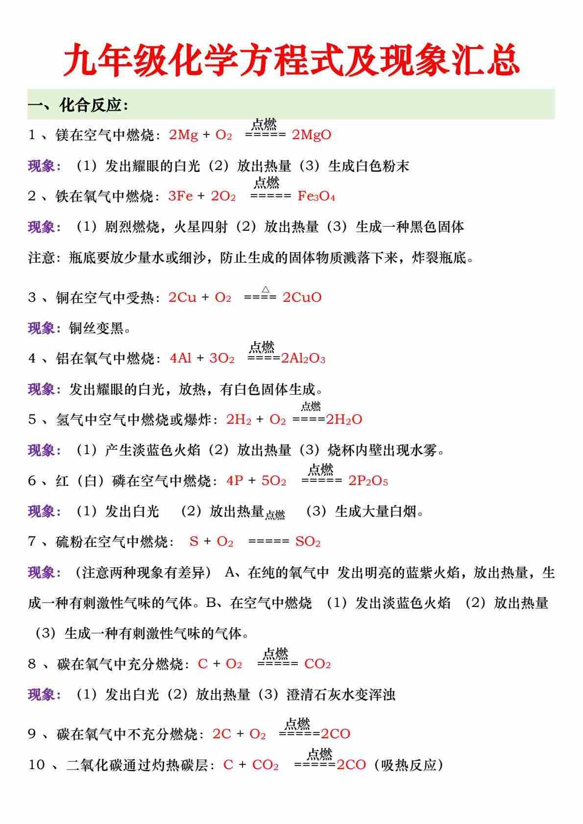 10初中化学常见的化学方程式