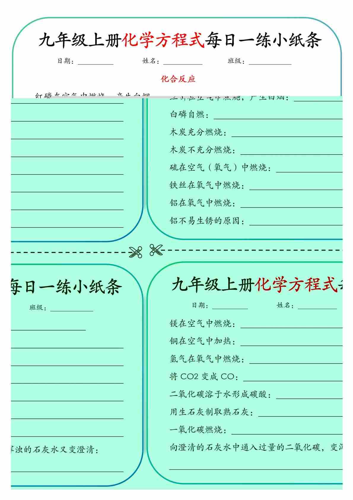 13初中重点化学方程式每日一练小纸条【空白】