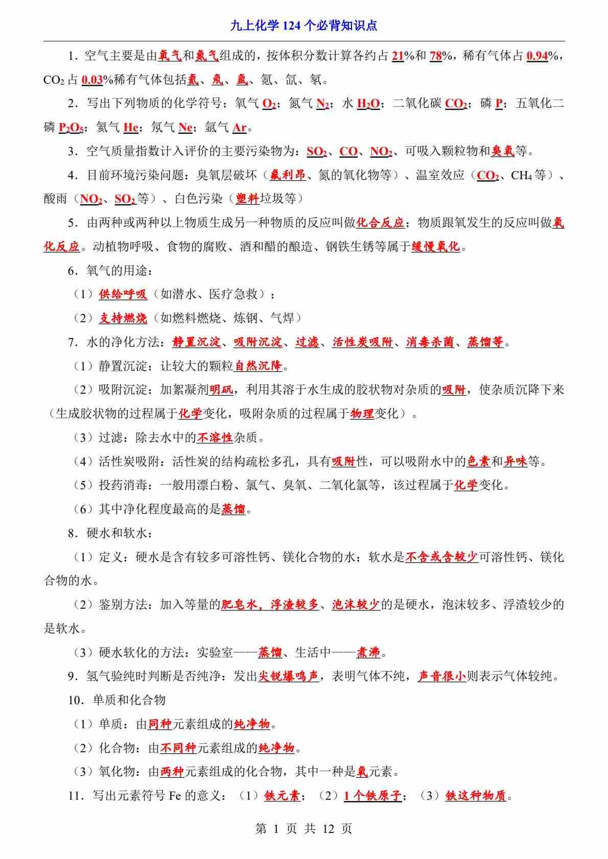 14九年级化学124个必背知识点