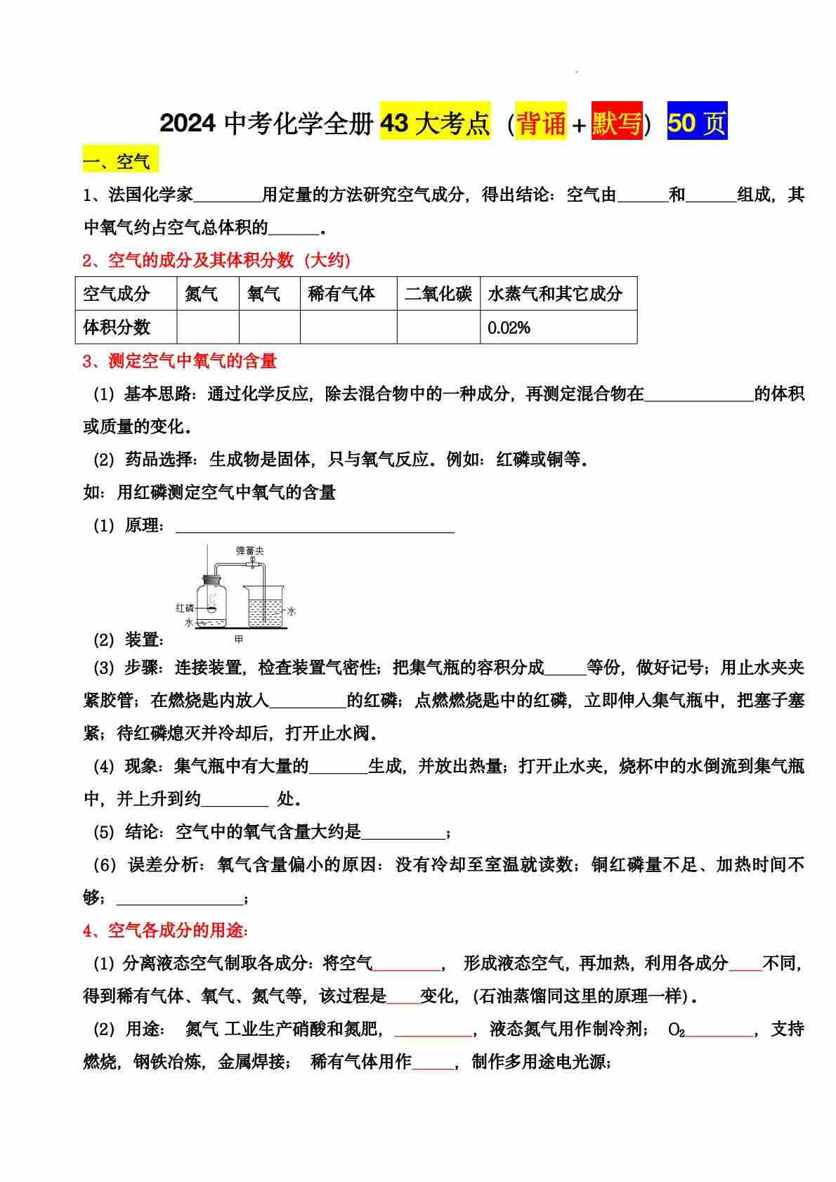 3.2024中考化学全册夯基43大考点(背诵+默写)50页