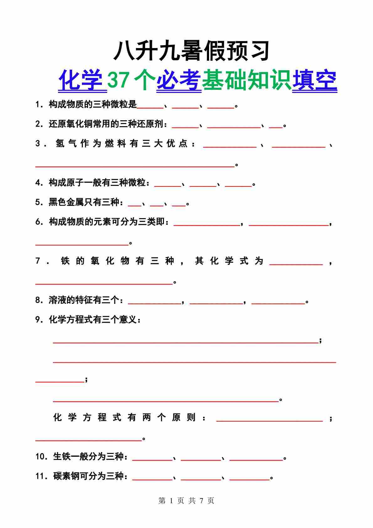 5八升九暑假预习化学37个必考基础知识填空