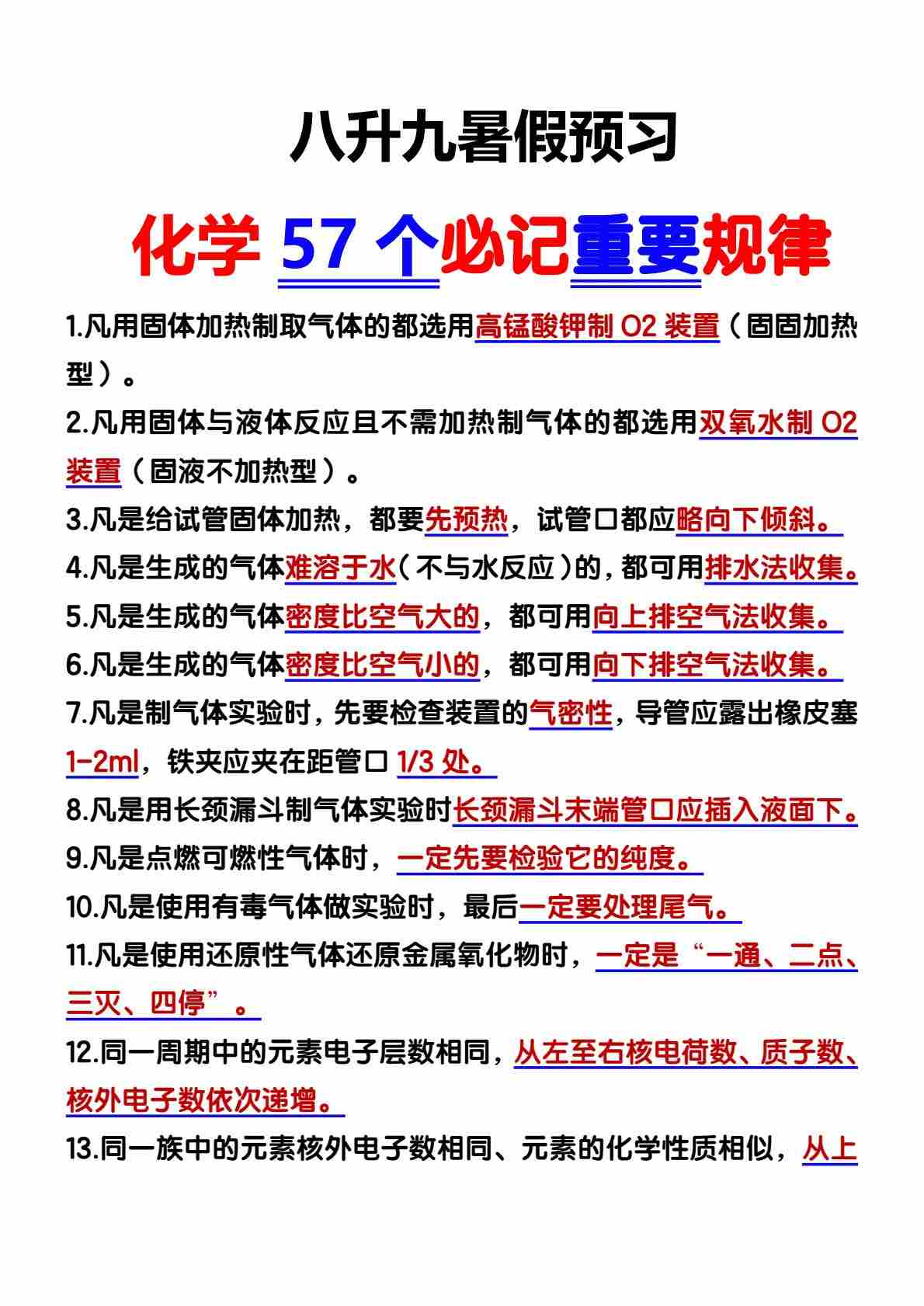 7八升九暑假预习化学57个必记重要规律背诵版