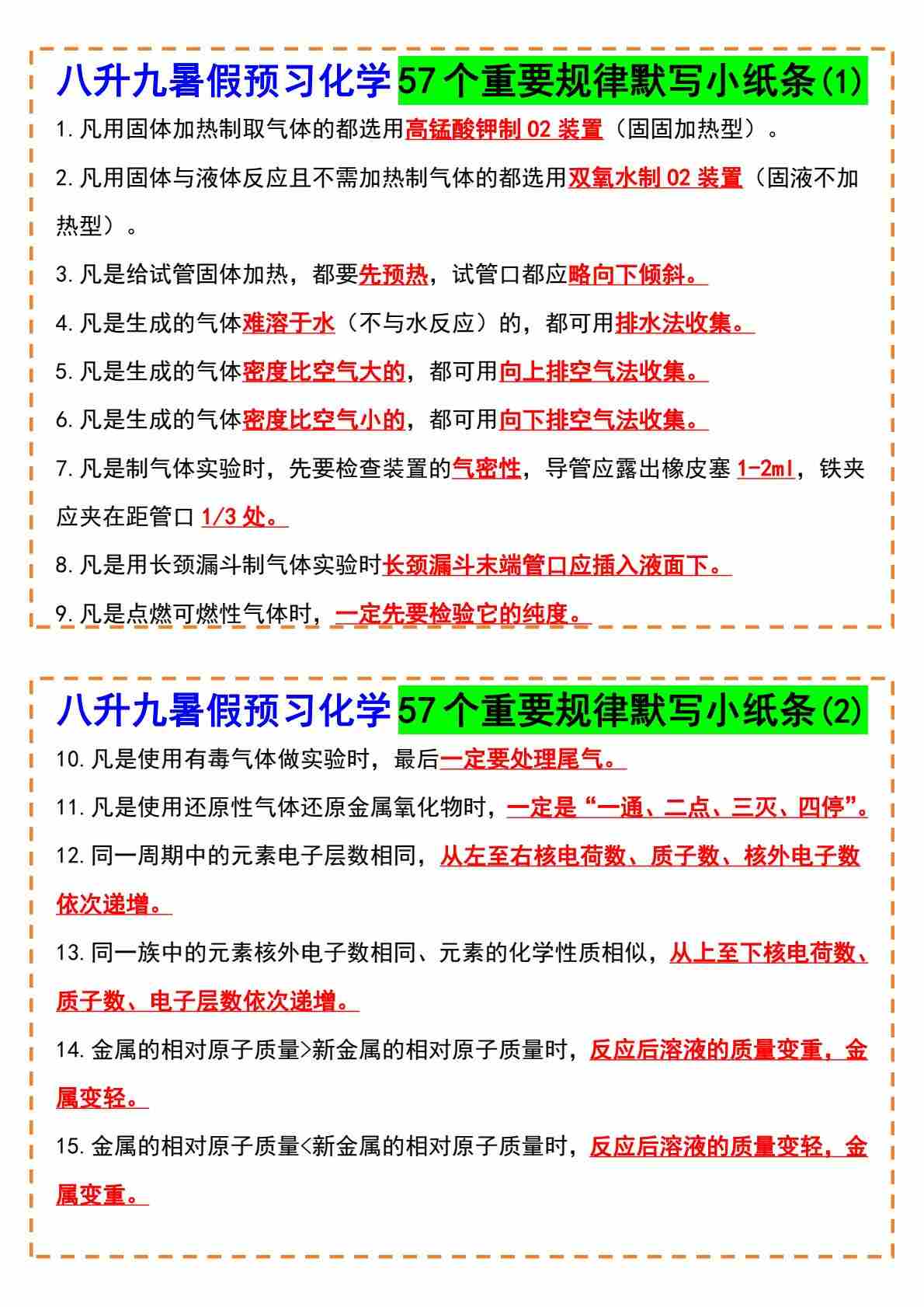 9八升九暑假预习化学57个重要规律默写小纸条