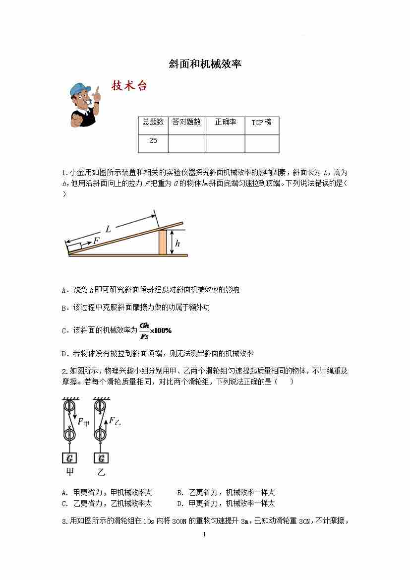 【期末冲刺】 考点过关训练:斜面和机械效率