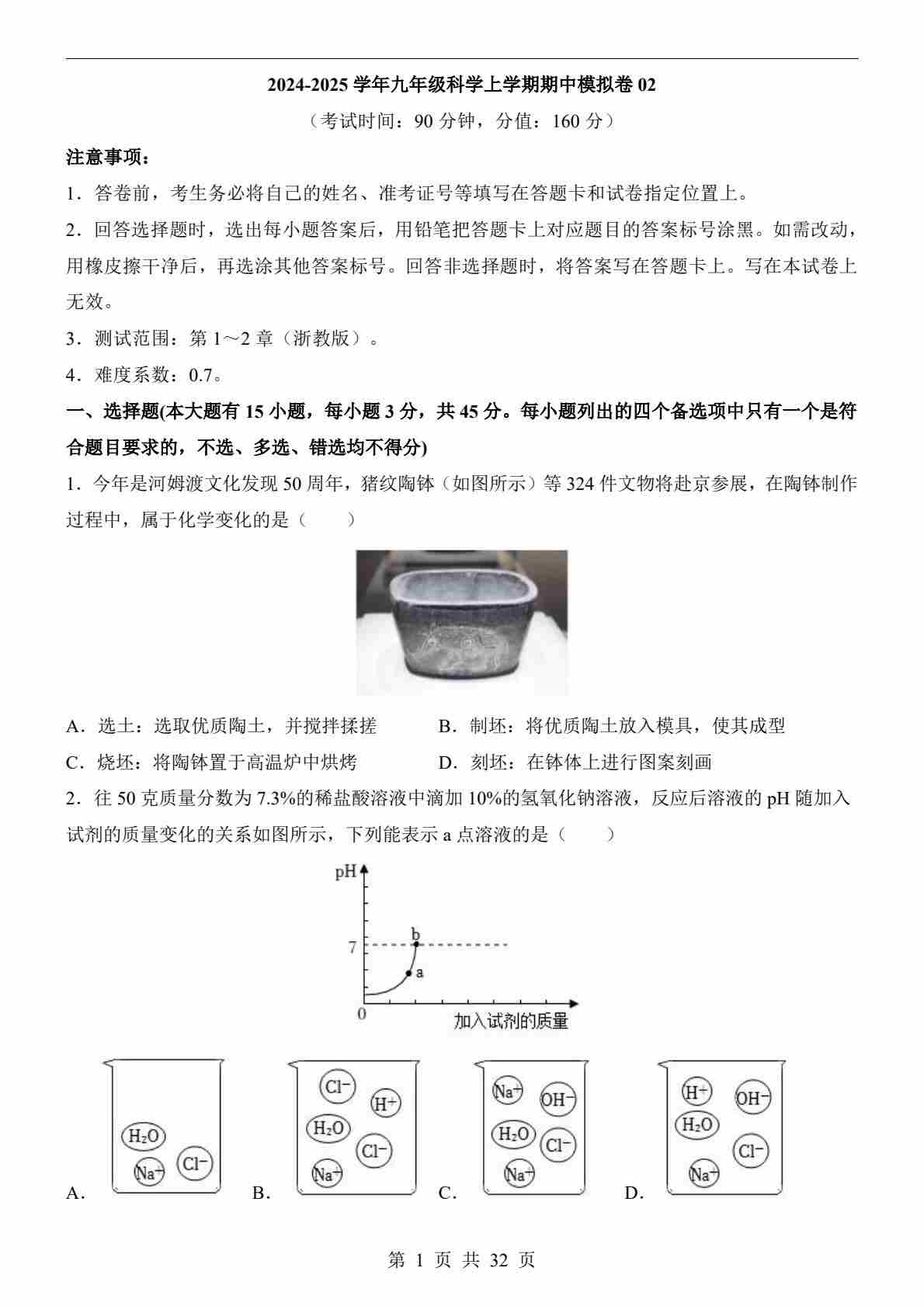 【浙教】9上科学期中卷02【第1-2章】