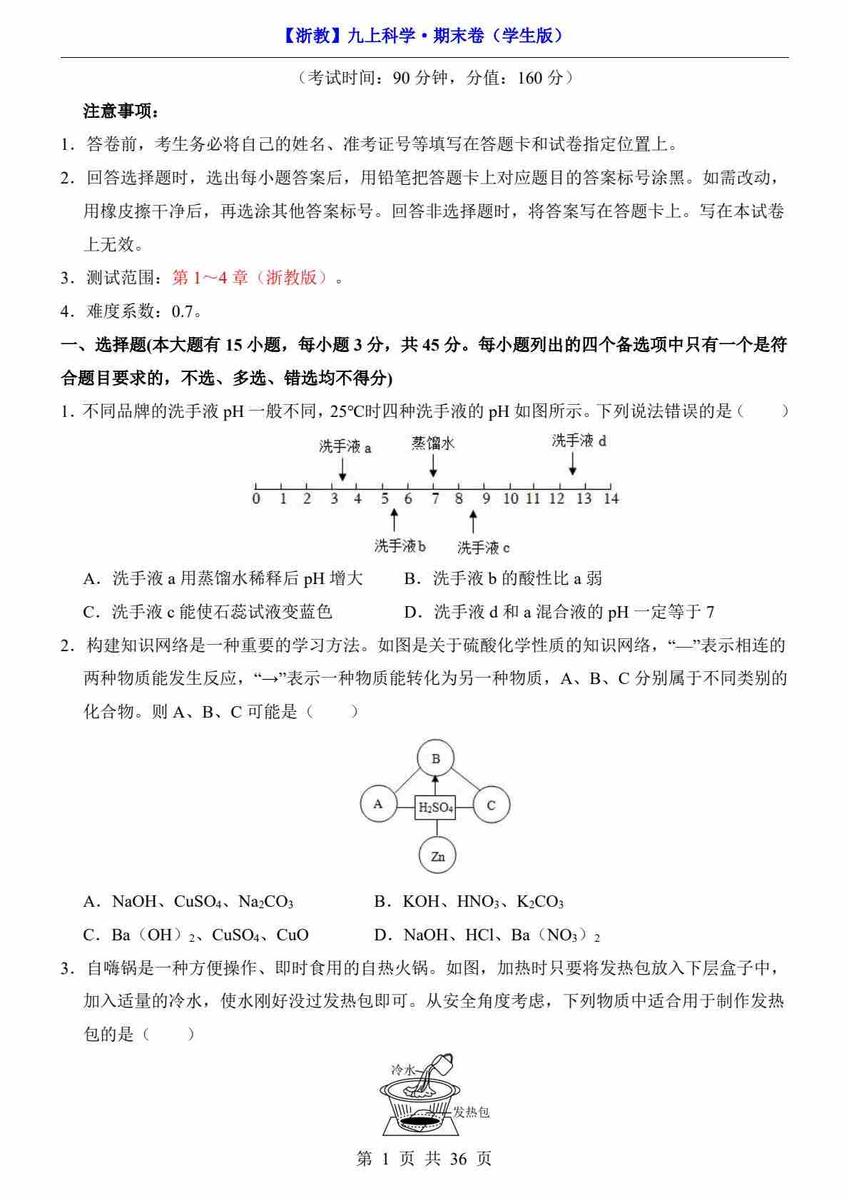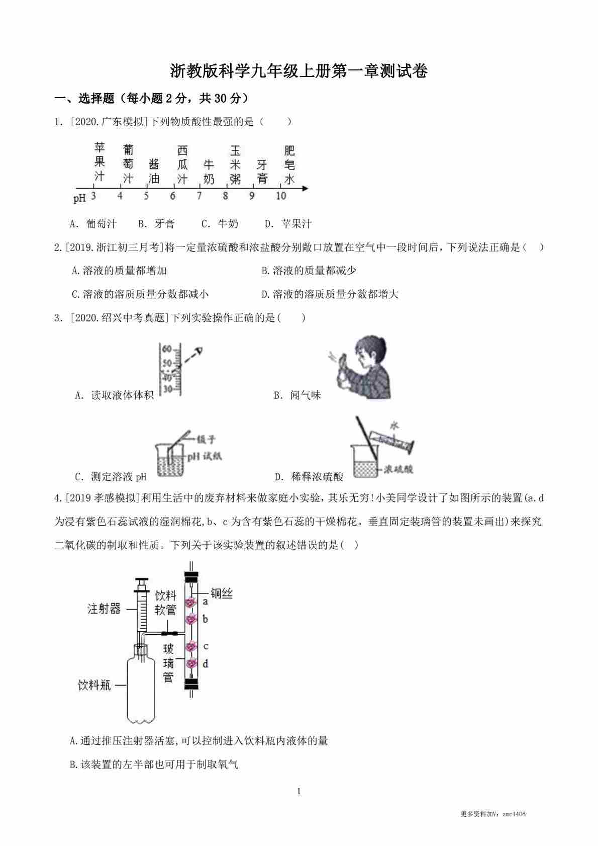浙教版科学九年级上册第一章测试卷