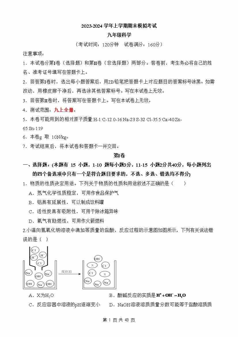 【浙教】9上科学期末卷01【9上全册】