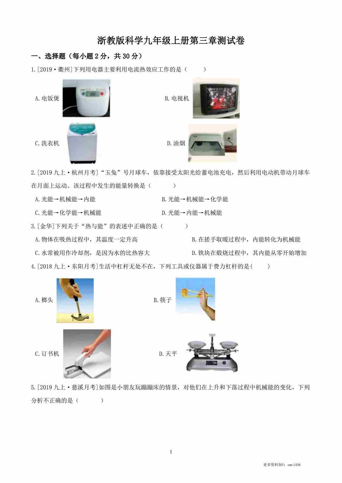 浙教版科学九年级上册第三章测试卷