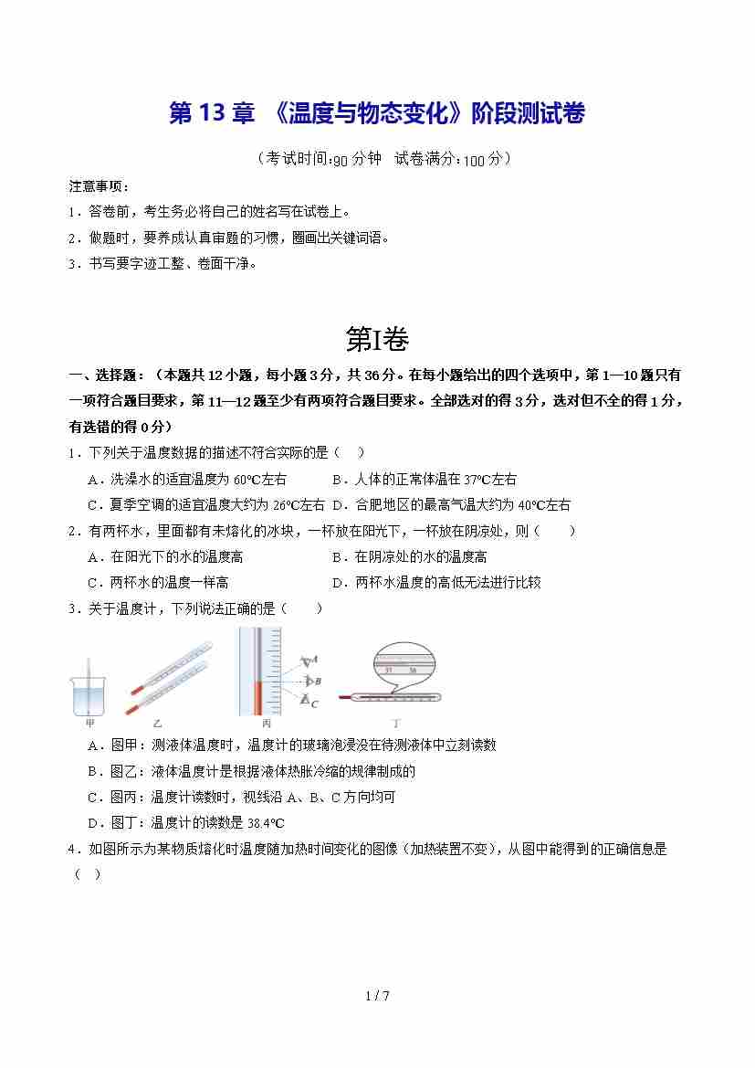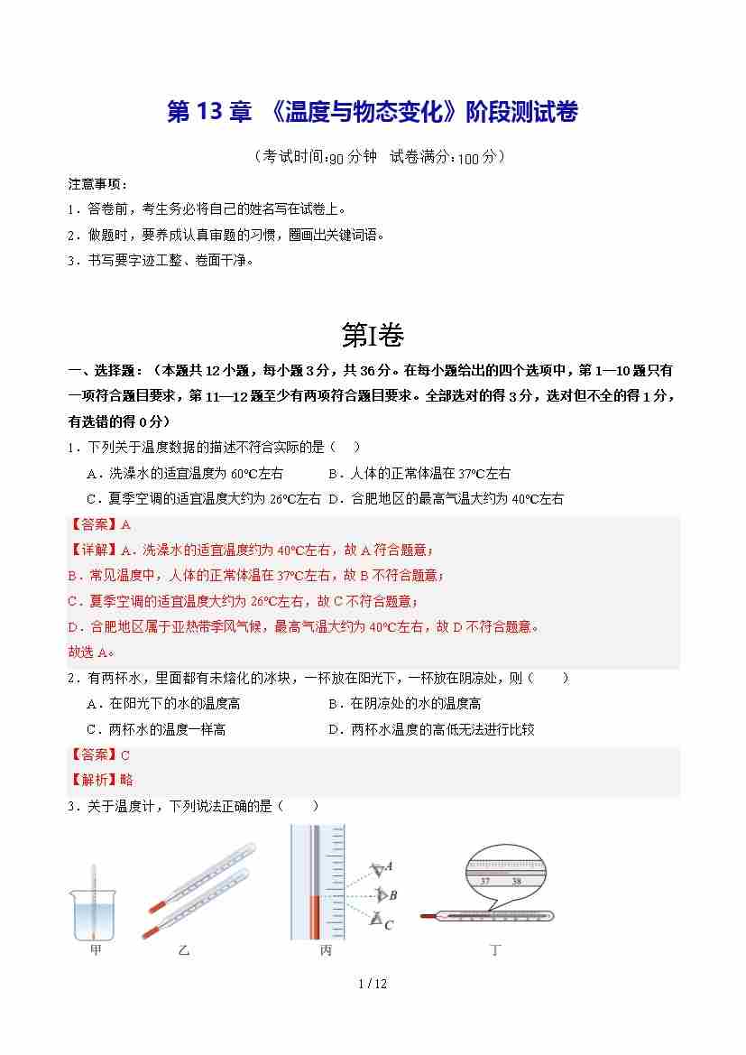 第2部分-预习-第11讲 《温度与物态变化》阶段测试卷【学生版】2025年新九年级物理暑假衔接讲义(沪科版)