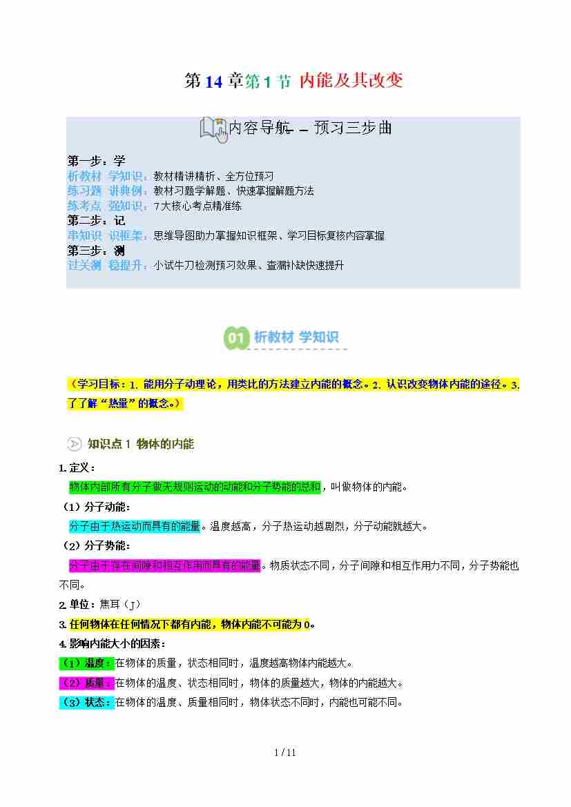 第2部分-预习-第12讲 内能及其改变【学生版】2025年新九年级物理暑假衔接讲义(沪科版)