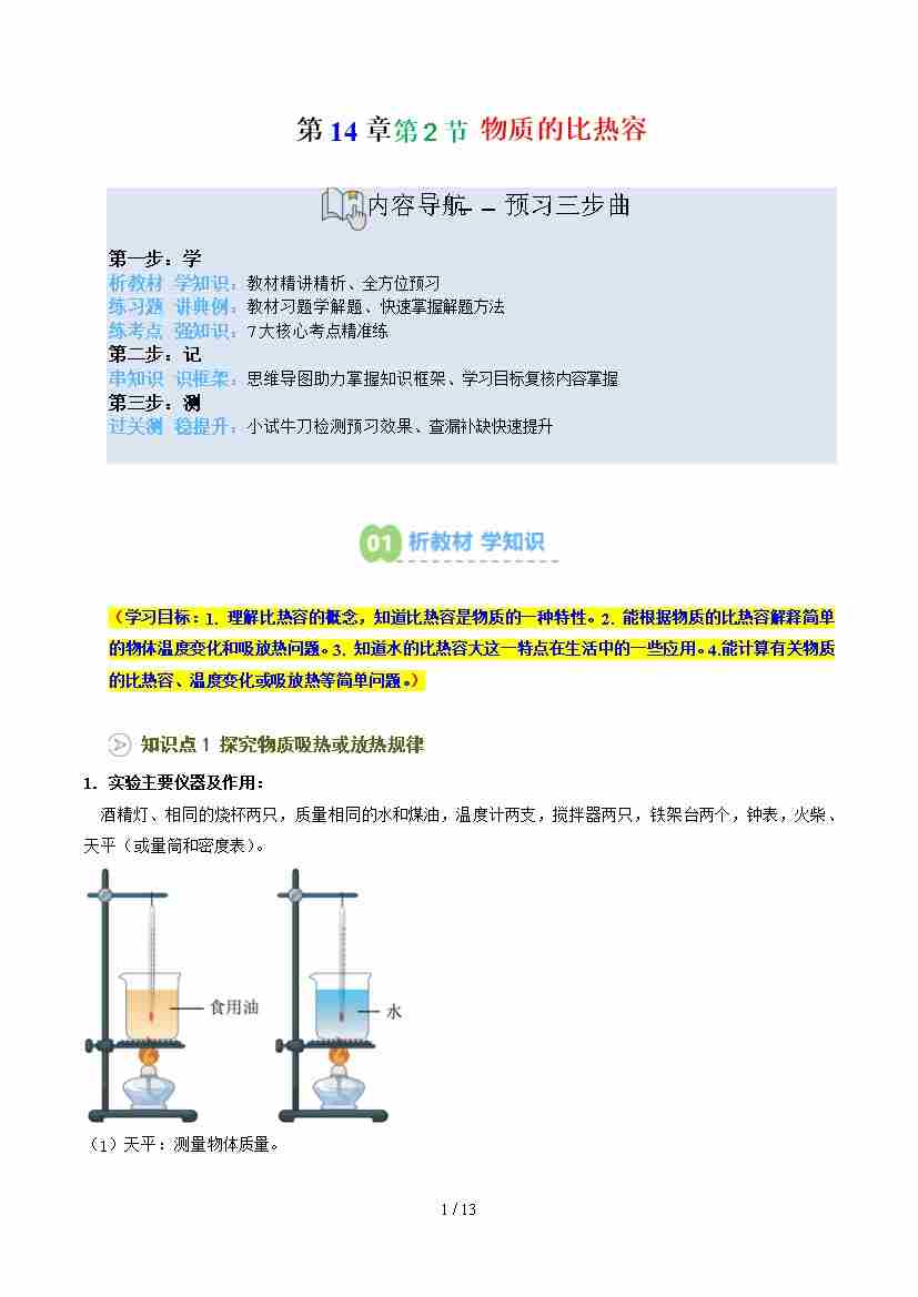 第2部分-预习-第13讲 物质的比热容【学生版】2025年新九年级物理暑假衔接讲义(沪科版)