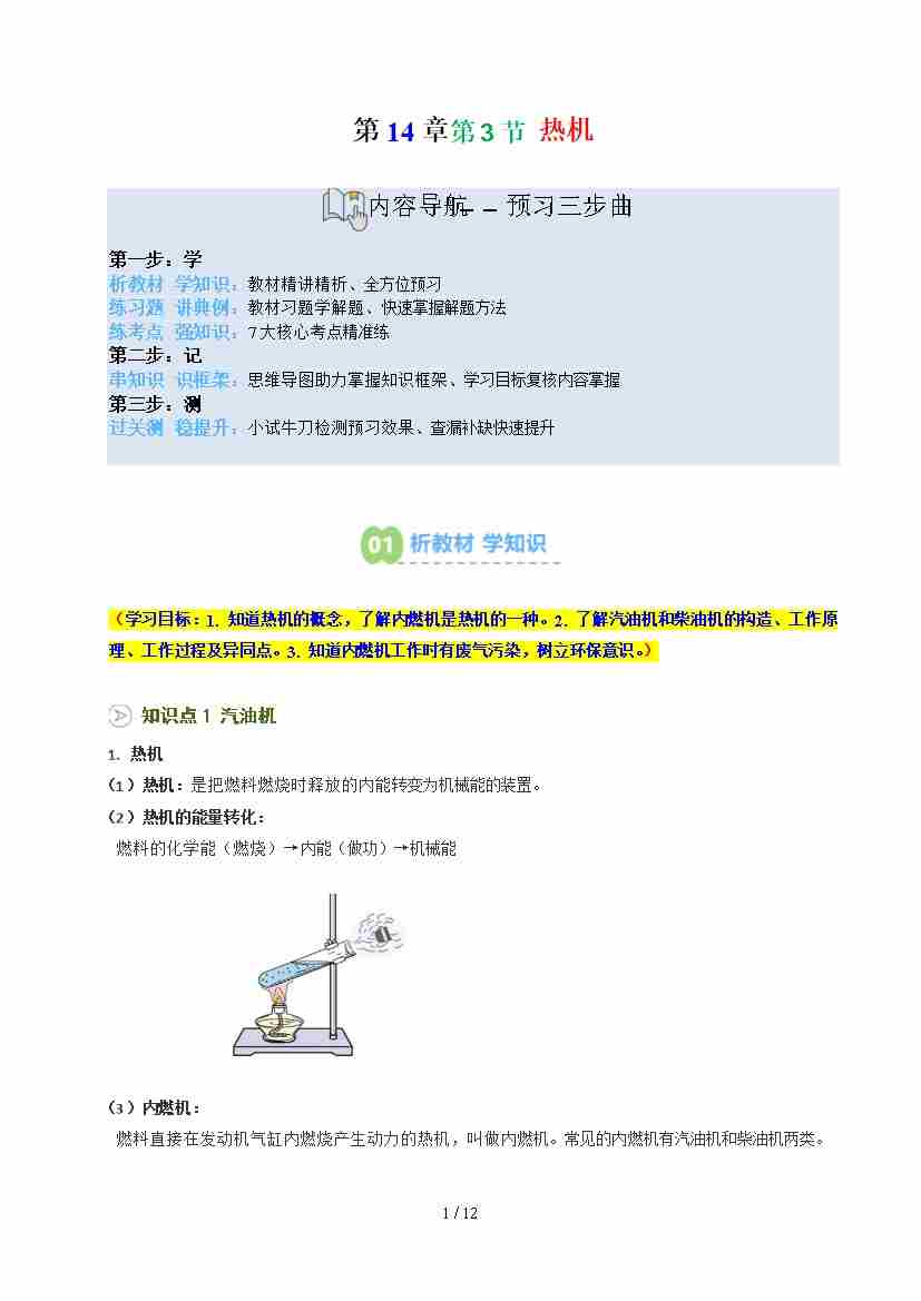 第2部分-预习-第14讲 热机【学生版】2025年新九年级物理暑假衔接讲义(沪科版)