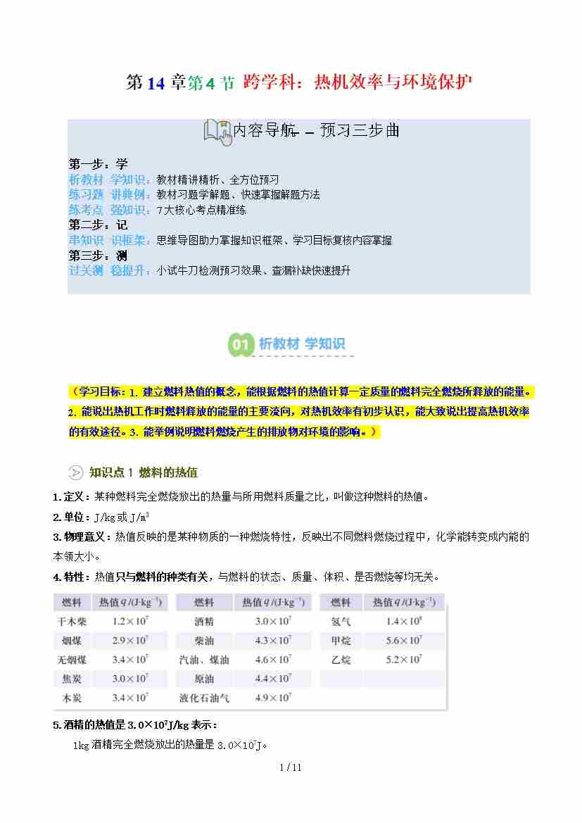 第2部分-预习-第15讲 跨学科:热机效率与环境保护【学生版】2025年新九年级物理暑假衔接讲义(沪科版)