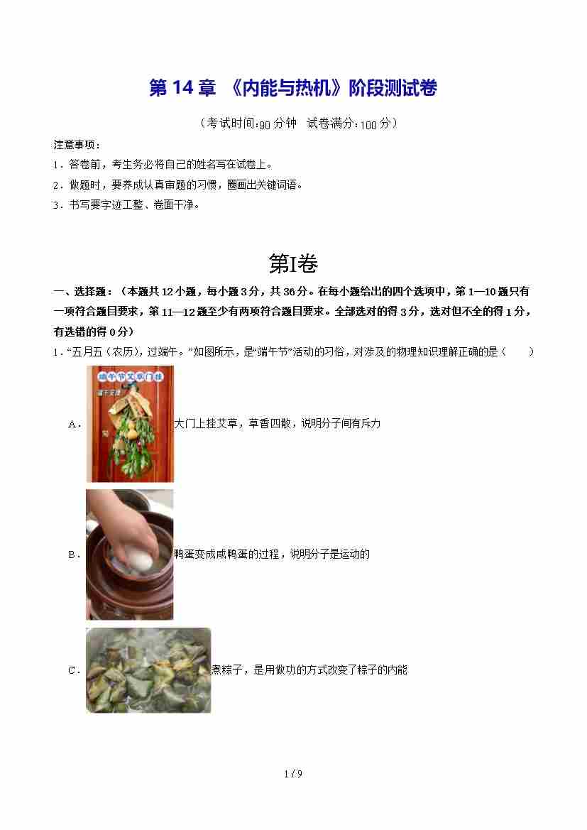 第2部分-预习-第16讲 《内能与热机》阶段测试卷【学生版】2025年新九年级物理暑假衔接讲义(沪科版)