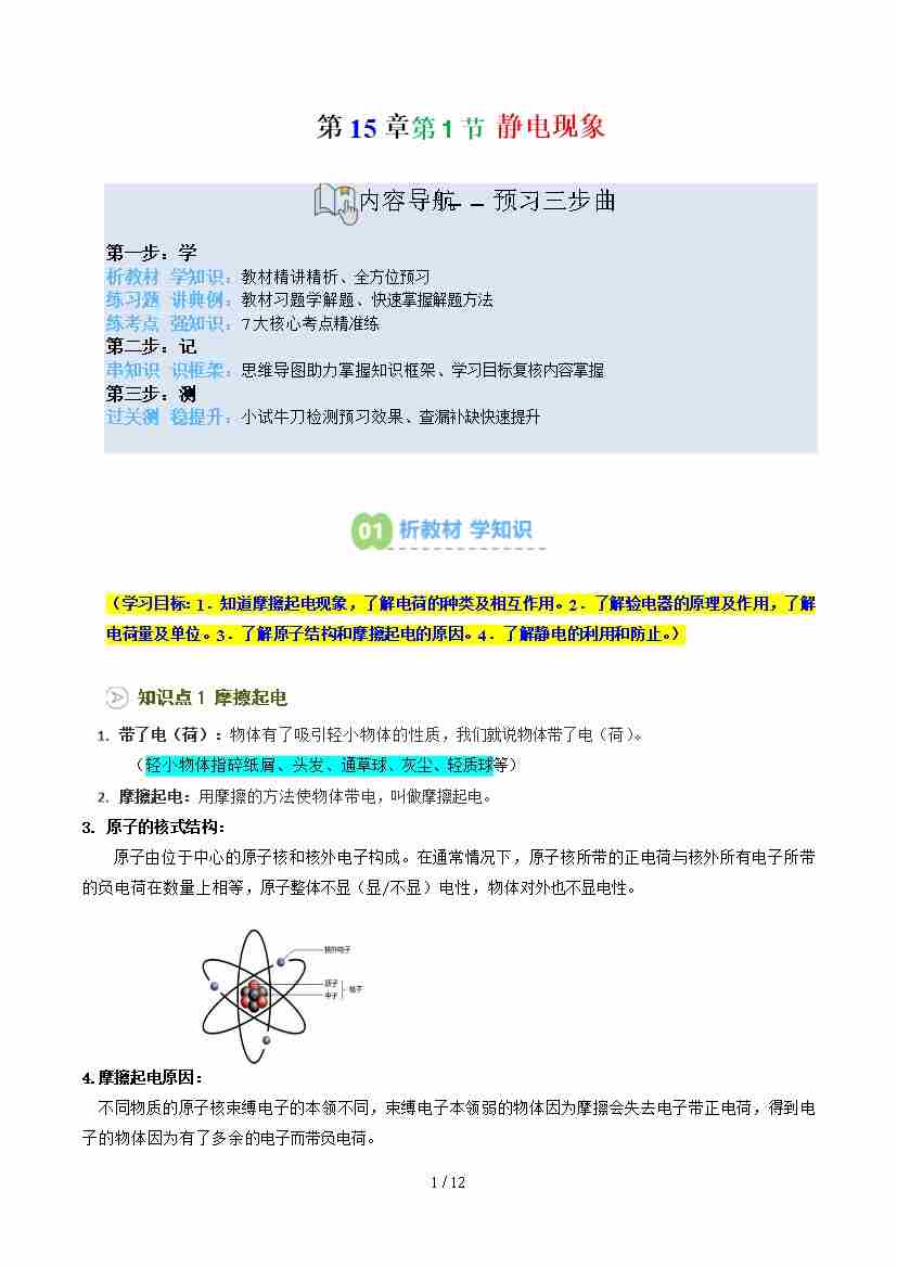 第2部分-预习-第17讲 静电现象【学生版】2025年新九年级物理暑假衔接讲义(沪科版)