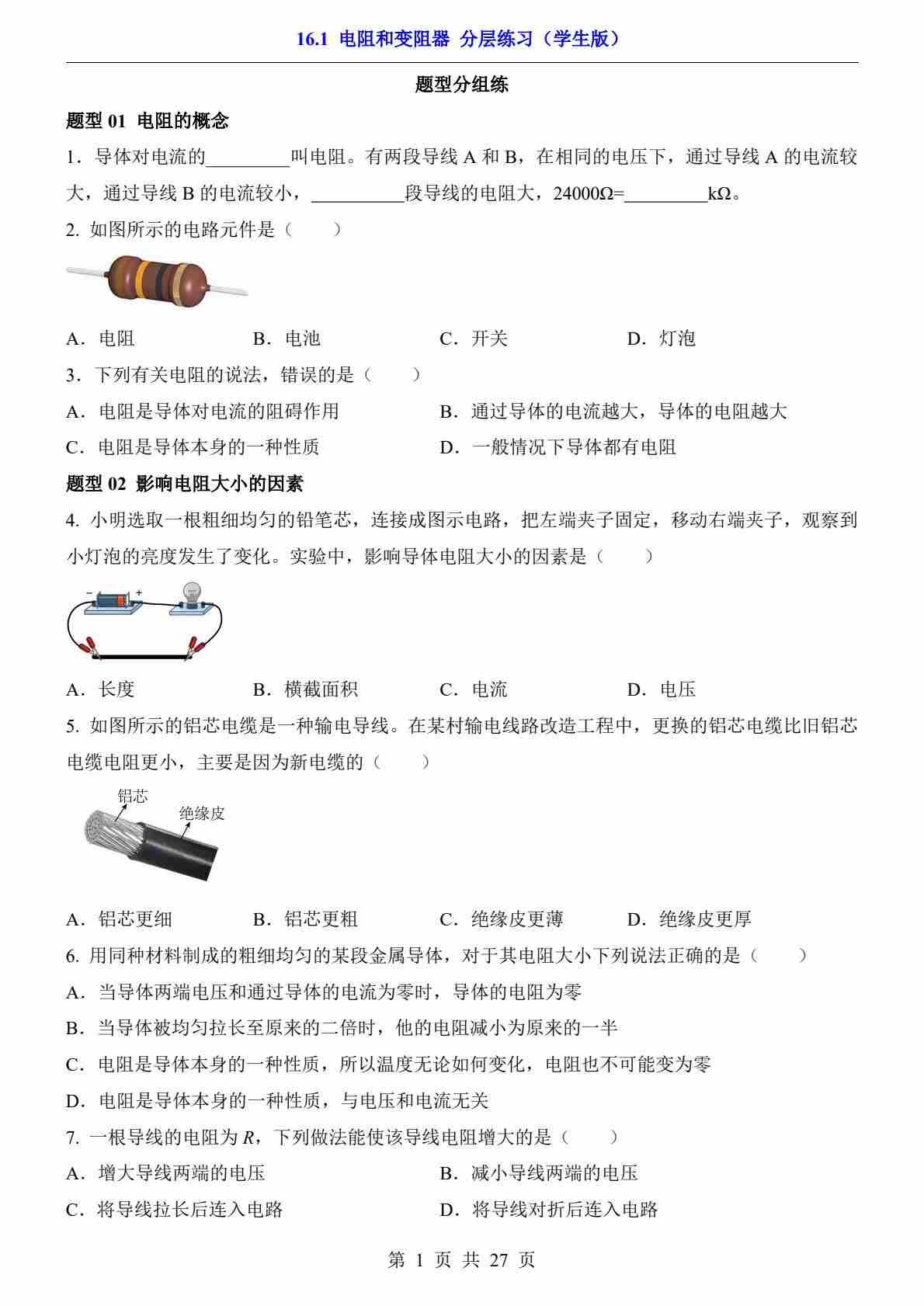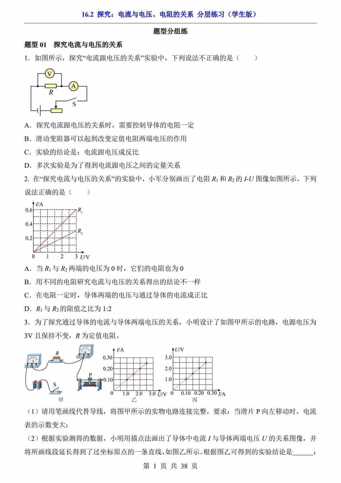 16.2 探究:电流与电压、电阻的关系(分层练习)