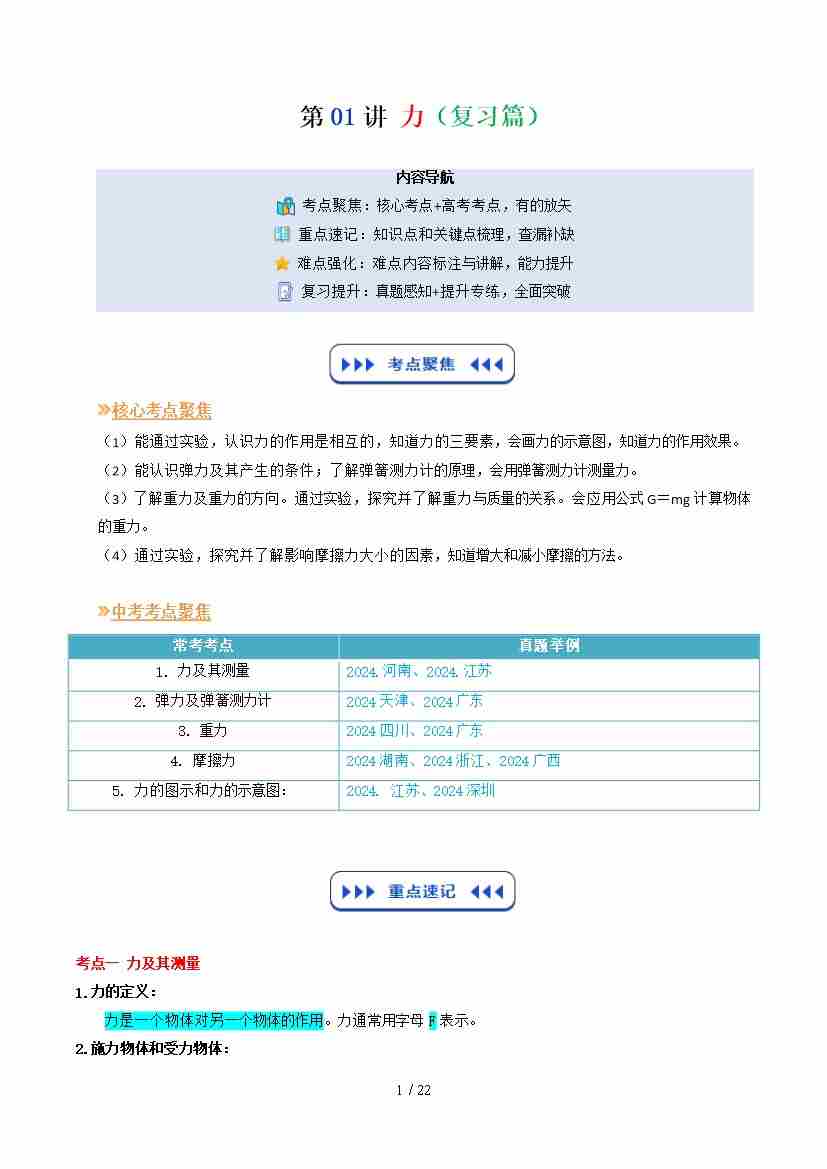第1部分 复习 第01讲 力【学生版】2025年新九年级物理暑假衔接讲义(沪科版)