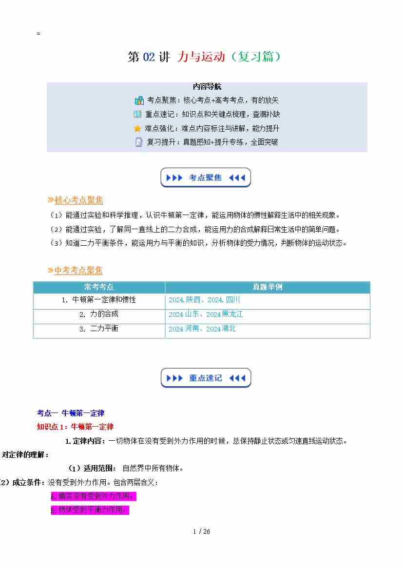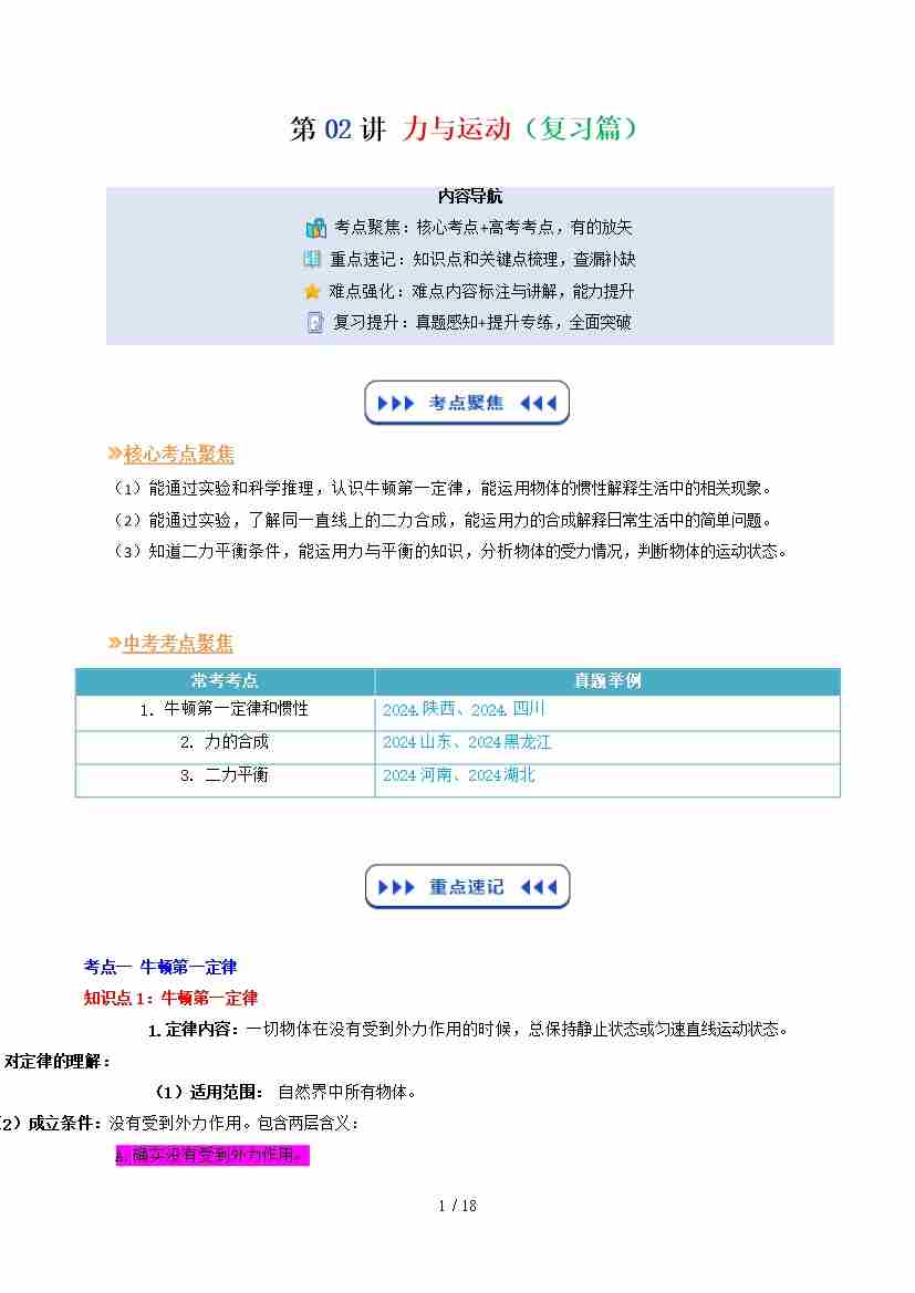 第1部分 复习 第02讲 力与运动【学生版】2025年新九年级物理暑假衔接讲义(沪科版)