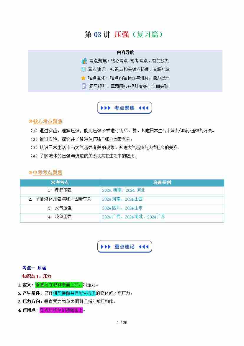 第1部分 复习 第03讲 压强【学生版】2025年新九年级物理暑假衔接讲义(沪科版)