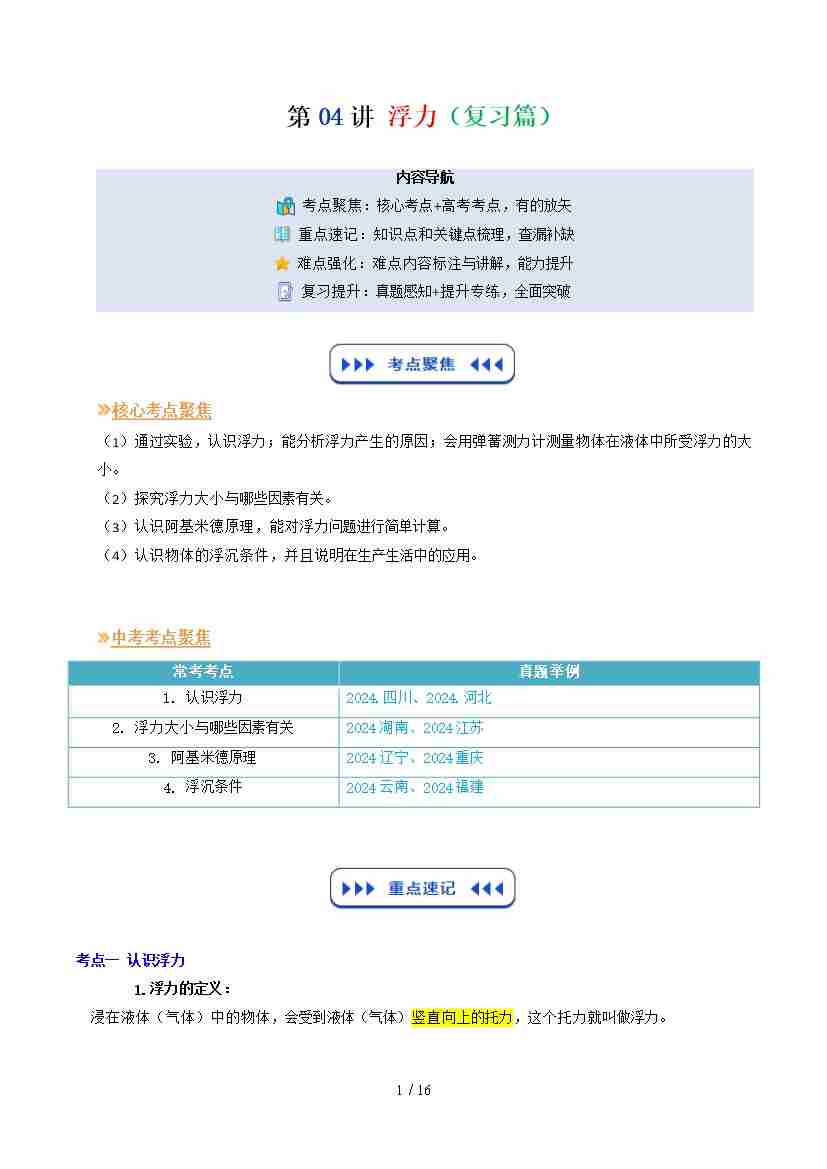第1部分 复习 第04讲 浮力【学生版】2025年新九年级物理暑假衔接讲义(沪科版)