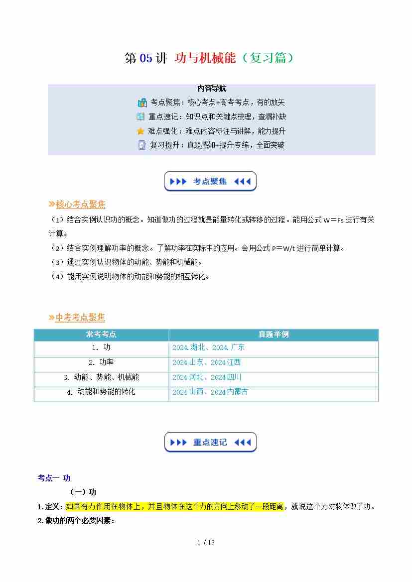第1部分 复习 第05讲 功与机械能【教师版】2025年新九年级物理暑假衔接讲义(沪科版)