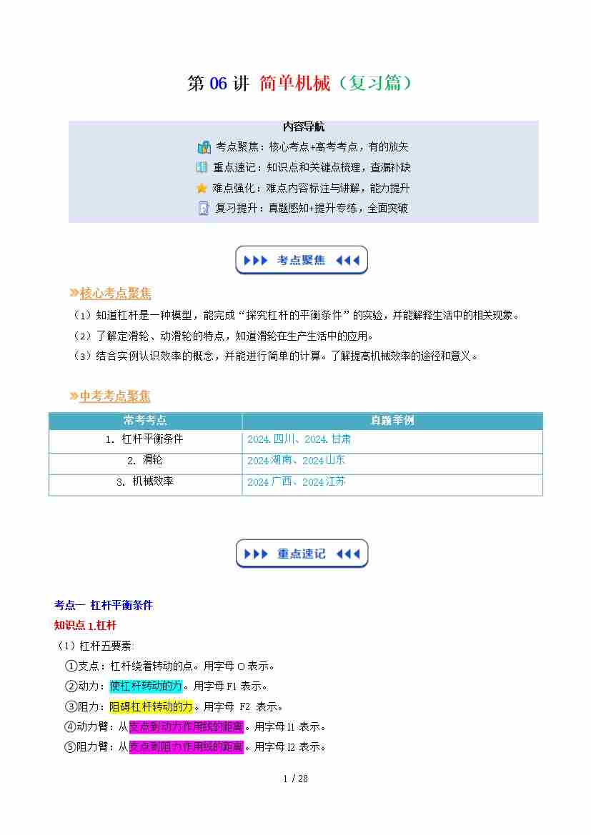 第1部分 复习 第06讲 简单机械【学生版】2025年新九年级物理暑假衔接讲义(沪科版)