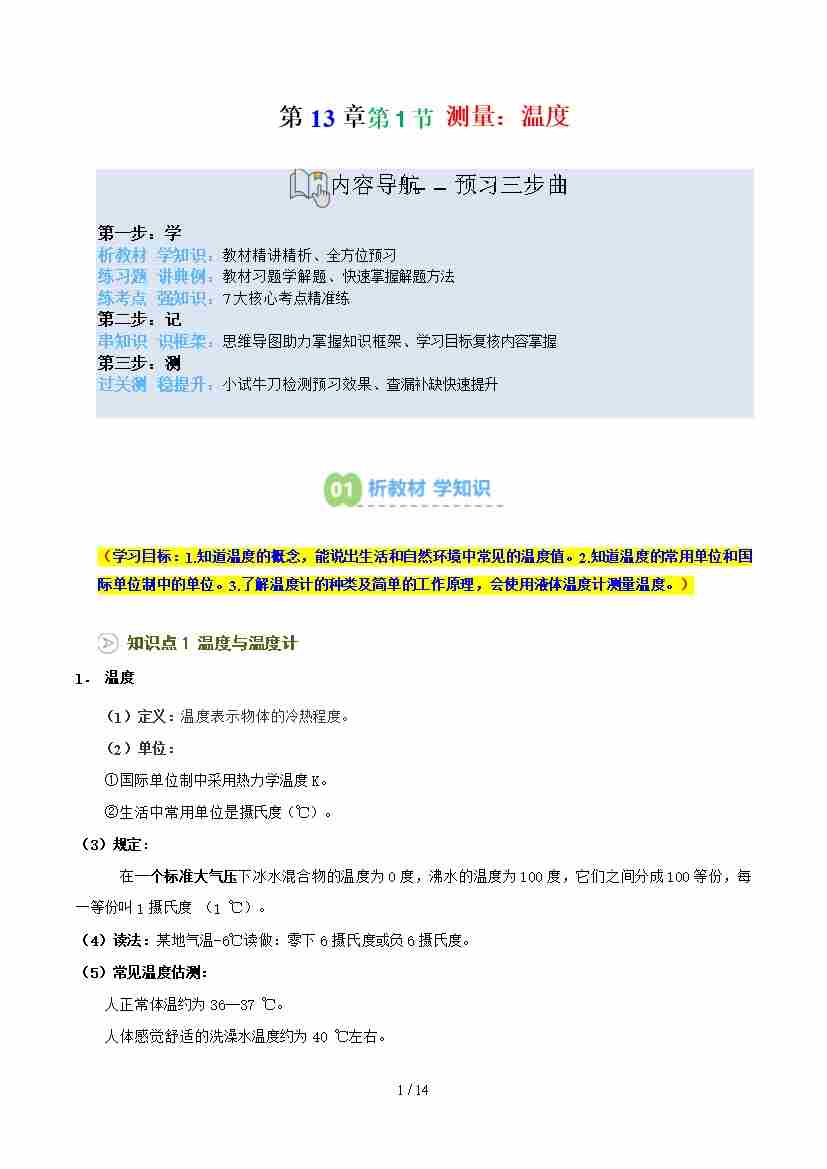 第2部分-预习-第07讲 测量:温度【学生版】2025年新九年级物理暑假衔接讲义(沪科版)