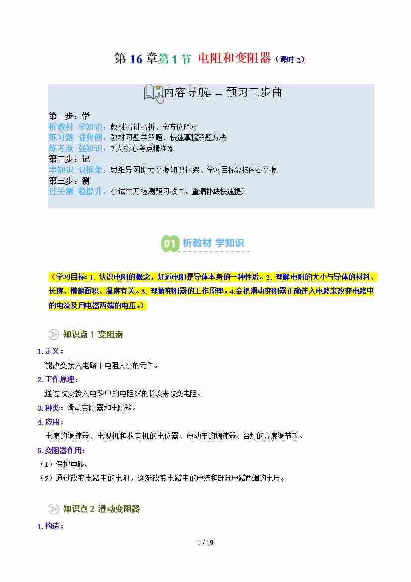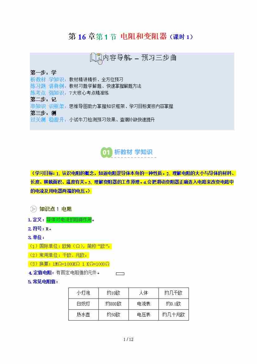 第2部分-预习-第24讲 电阻和变阻器课时2【学生版】2025年新九年级物理暑假衔接讲义(沪科版)