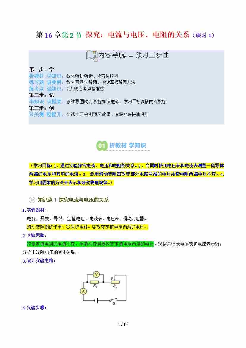 第2部分-预习-第25讲 探究:电流与电压、电阻的关系(课时1)【学生版】2025年新九年级物理暑假衔接讲义(沪科版)