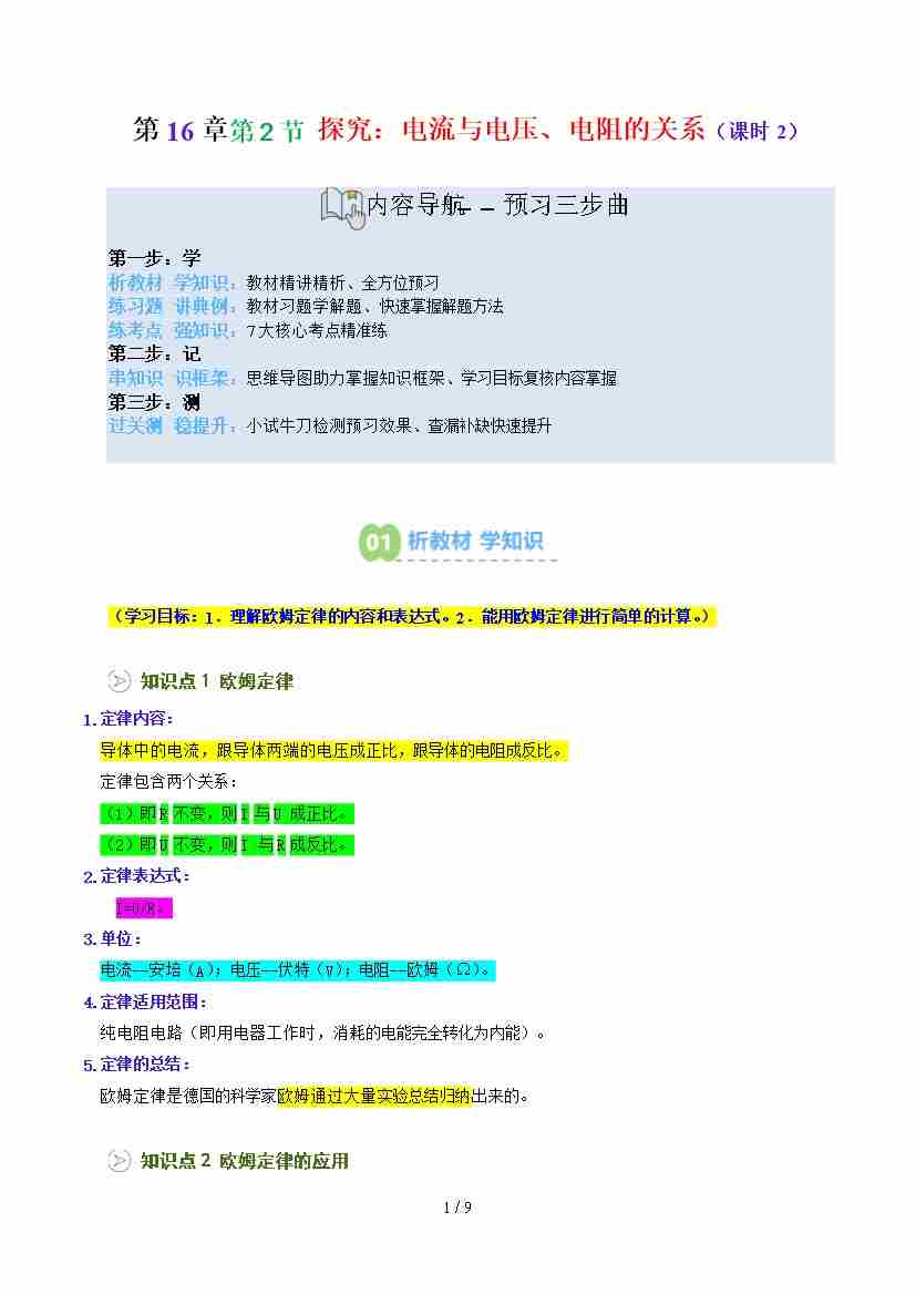 第2部分-预习-第26讲 探究:电流与电压、电阻的关系(课时2)【学生版】2025年新九年级物理暑假衔接讲义(沪科版)
