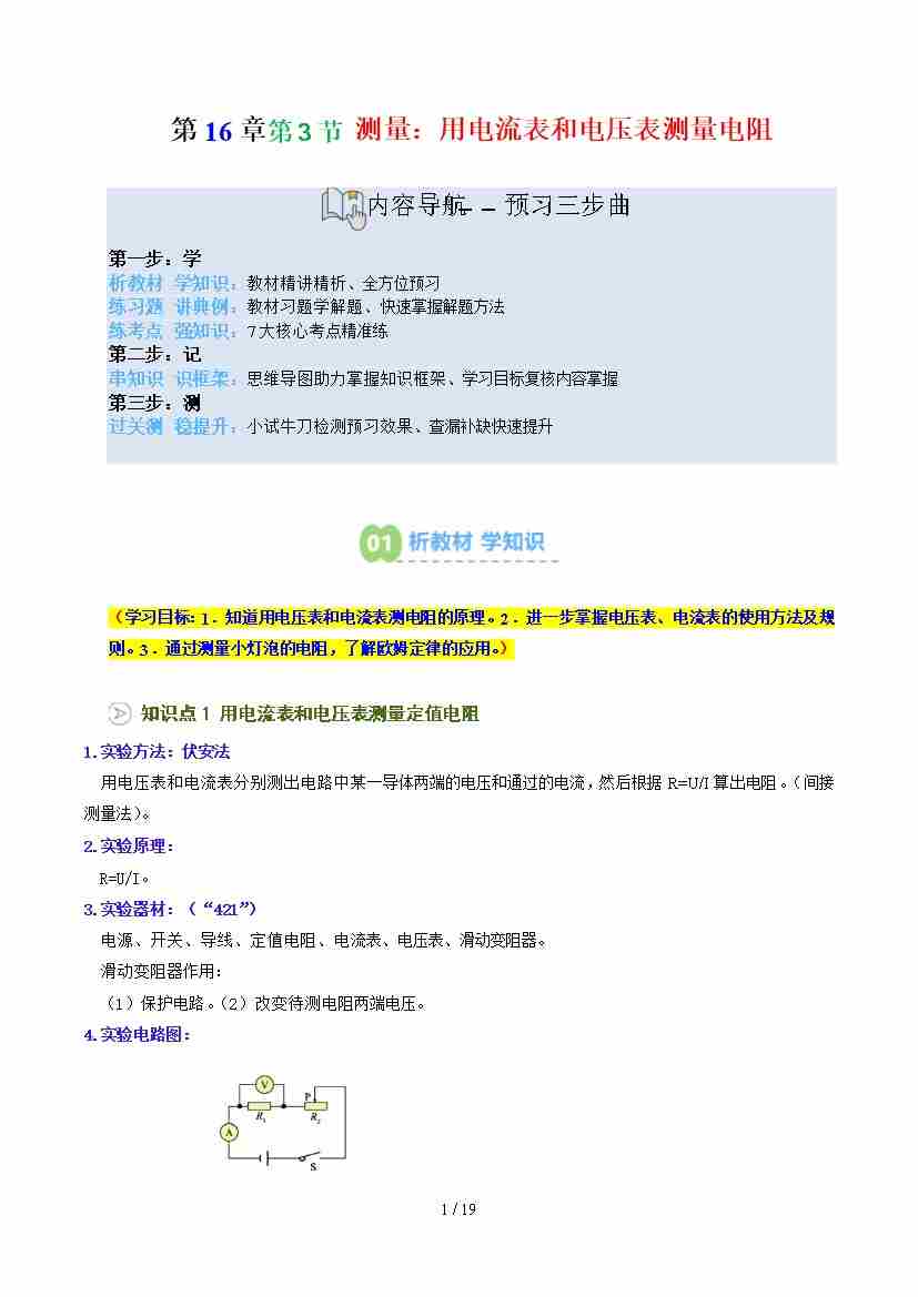 第2部分-预习-第27讲 测量:用电流表和电压表测量电阻【学生版】2025年新九年级物理暑假衔接讲义(沪科版)