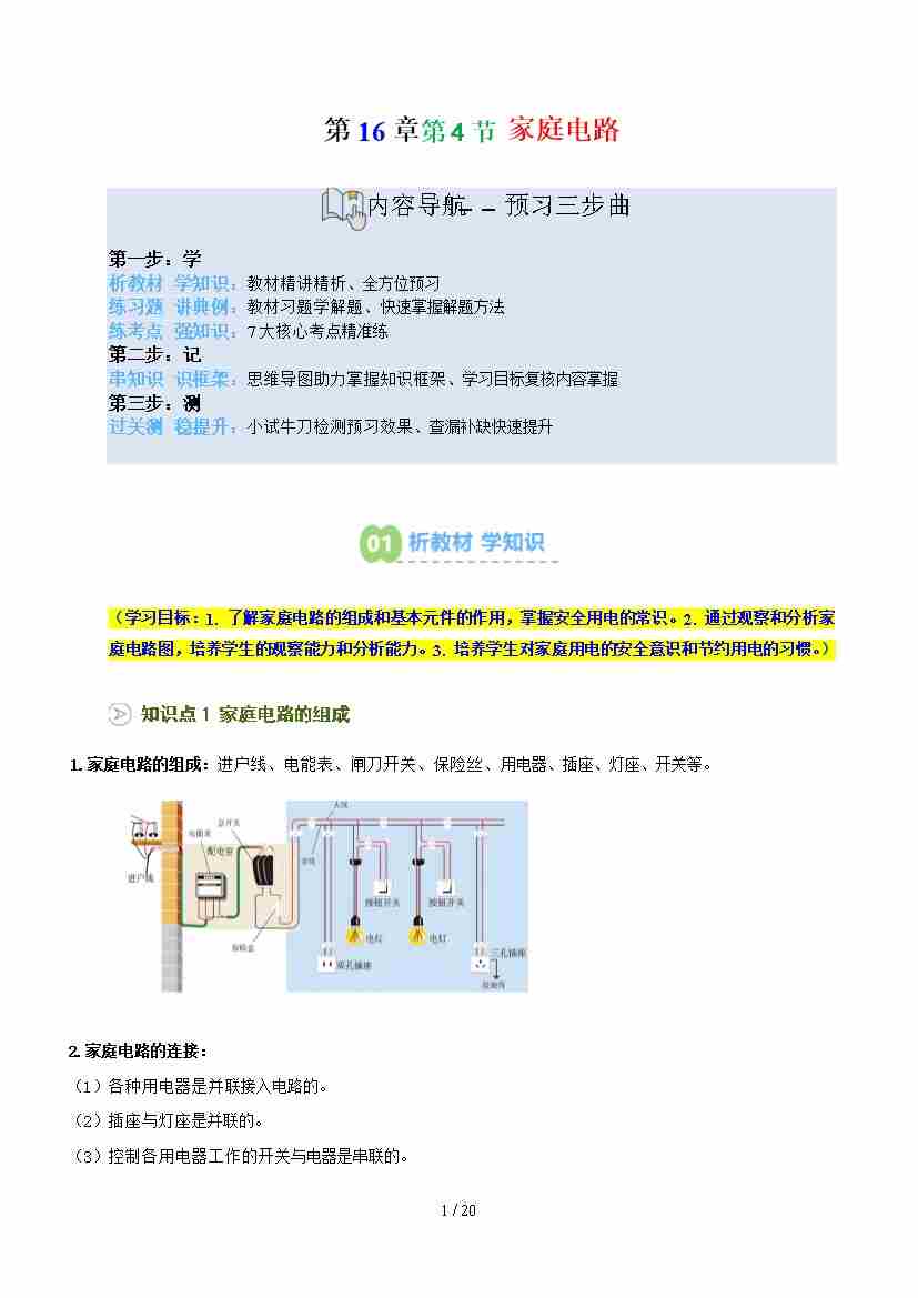 第2部分-预习-第28讲 家庭电路【学生版】2025年新九年级物理暑假衔接讲义(沪科版)