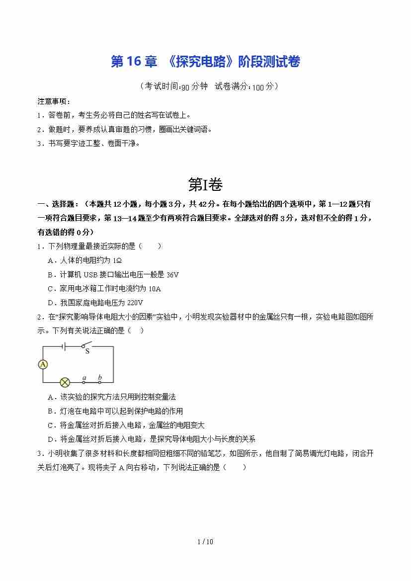 第2部分-预习-第29讲 《探究电路》阶段测试卷【学生版】2025年新九年级物理暑假衔接讲义(沪科版)