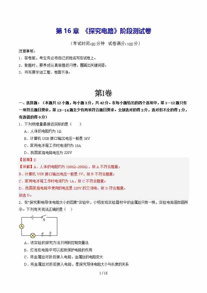 第2部分-预习-第29讲 《探究电路》阶段测试卷【教师版】2025年新九年级物理暑假衔接讲义(沪科版)