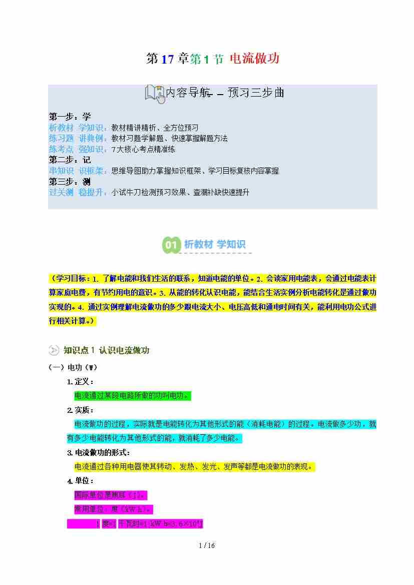 第2部分-预习-第30讲 电流做功【学生版】2025年新九年级物理暑假衔接讲义(沪科版)
