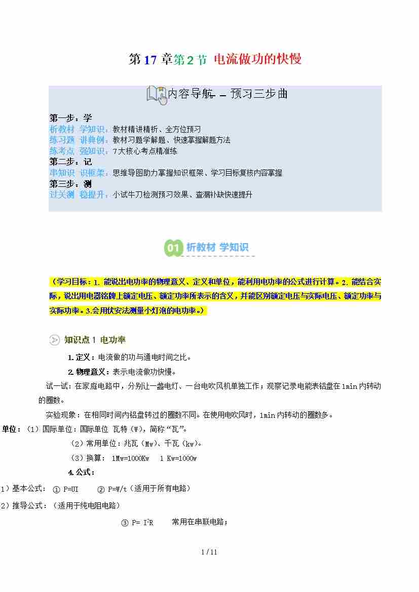 第2部分-预习-第31讲 电流做功的快慢【学生版】2025年新九年级物理暑假衔接讲义(沪科版)