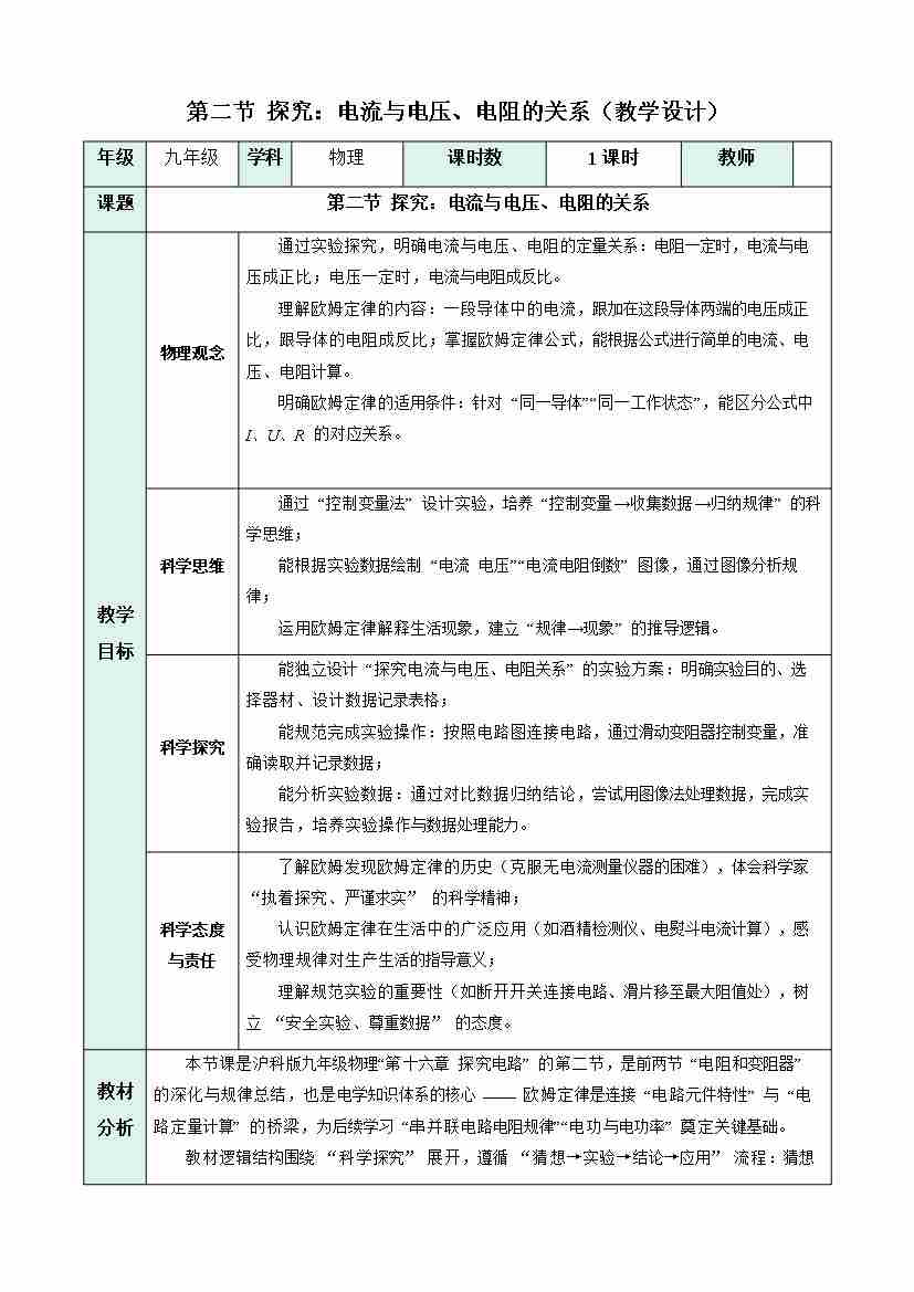 第二节 探究:电流与电压、电阻的关系(表格式教学设计)物理沪科版2024九年级全一册