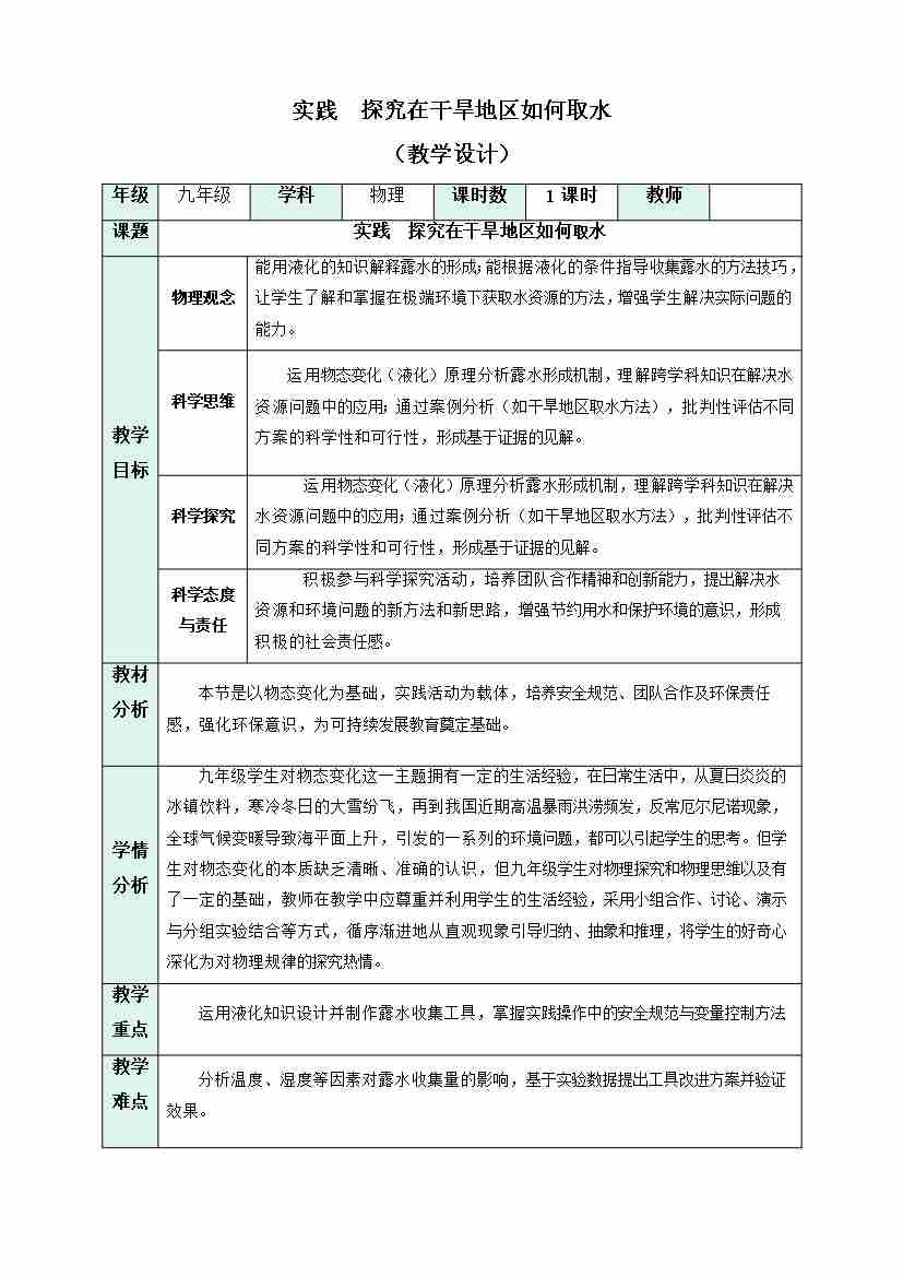 实践 探究在干旱地区如何取水(教学设计)物理沪科版2024九年级全一册