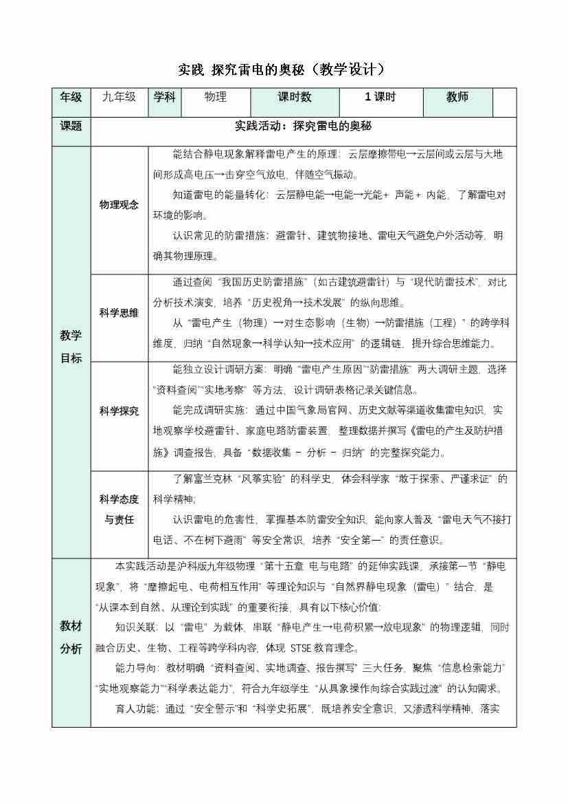 实践 探究雷电的奥秘(教学设计)物理沪科版2024九年级全一册