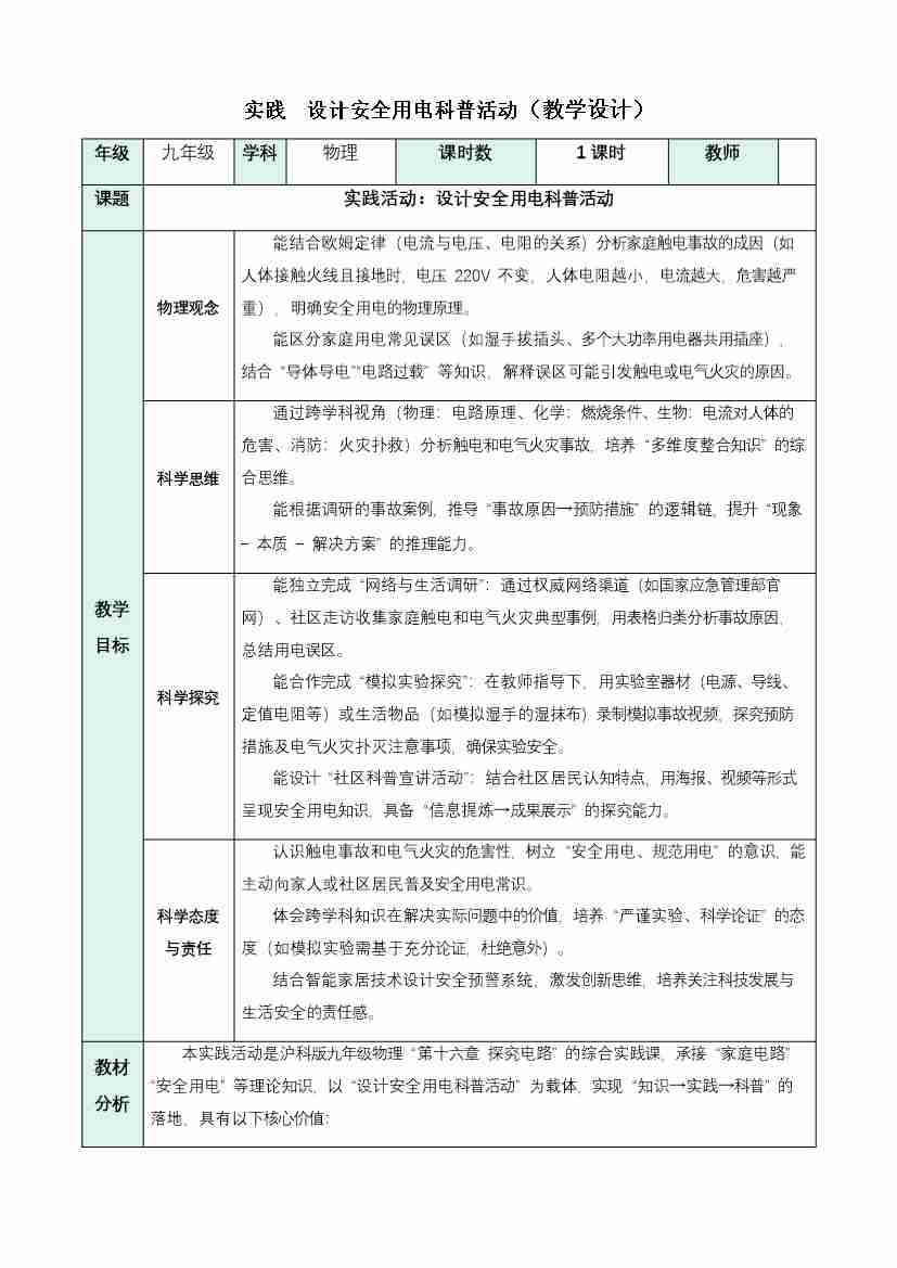 实践 设计安全用电科普活动(表格式教学设计)物理沪科版2024九年级全一册