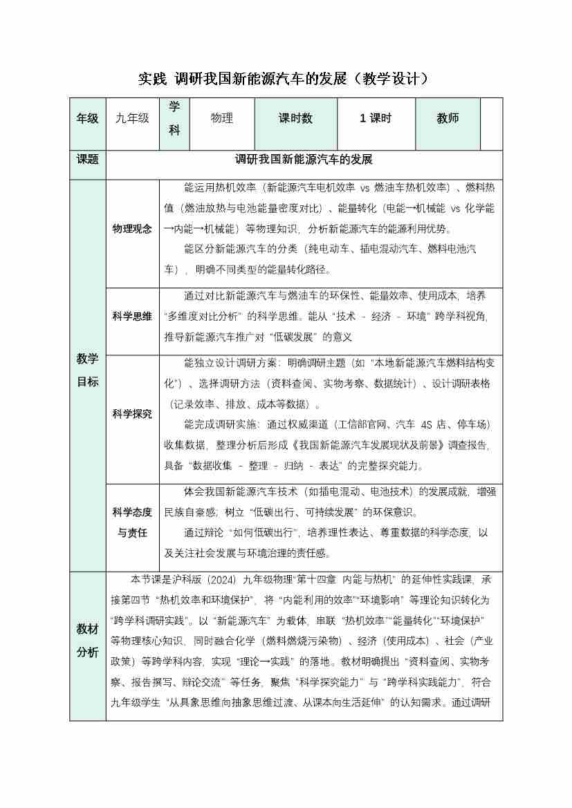 实践 调研我国新能源汽车的发展(教学设计)物理沪科版2024九年级全一册