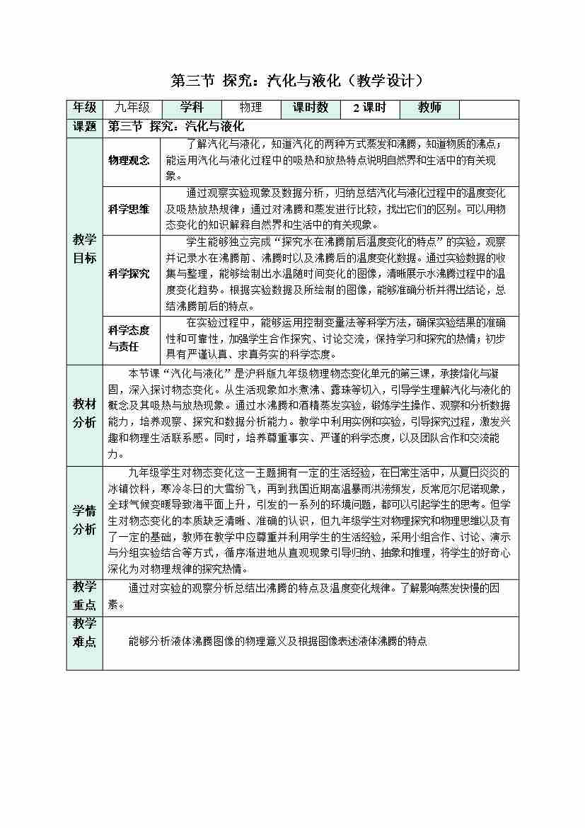 第三节 探究:汽化与液化(教学设计)物理沪科版2024九年级全一册